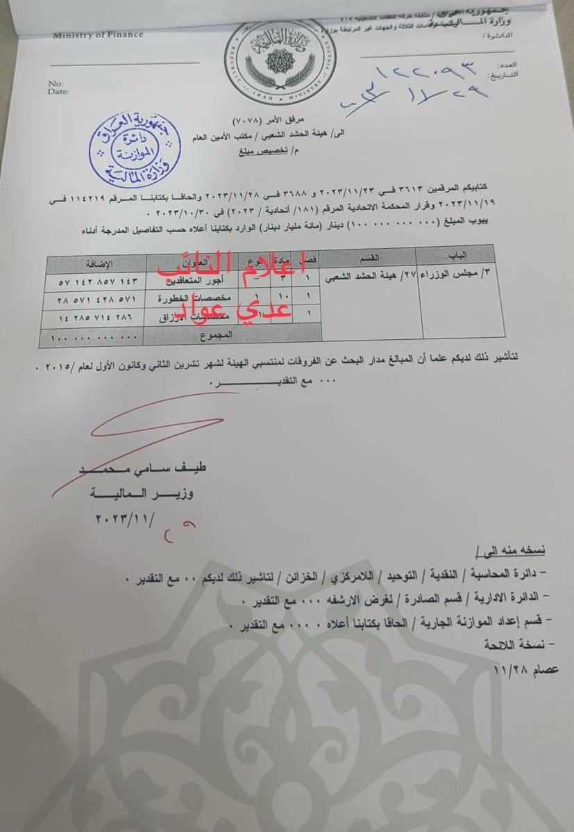 بالوثيقة .. عواد يعلن موافقة وزارة المالية على تخصيص مبالغ فروقات منتسبي الحشد الشعبي
