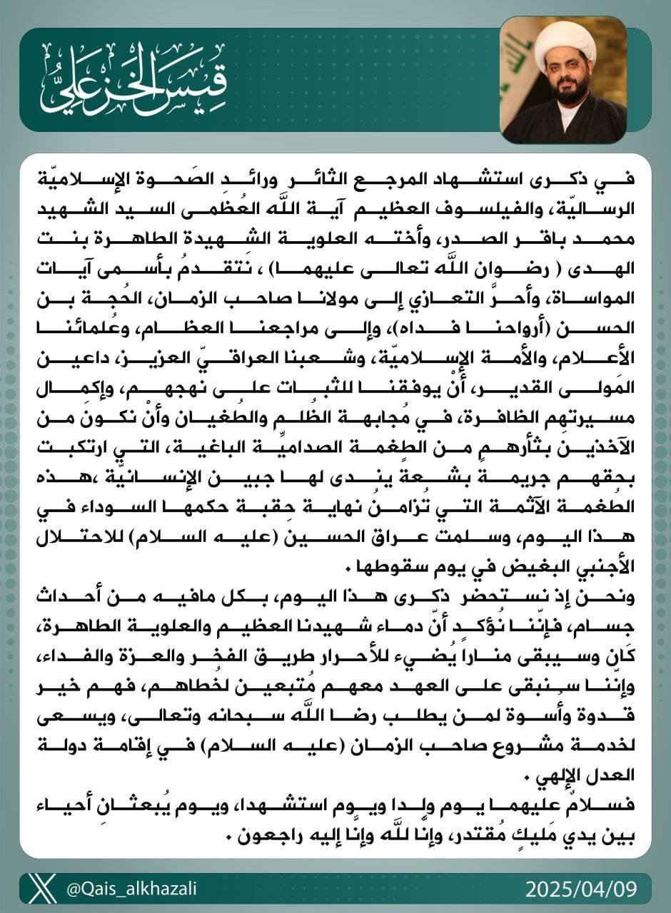 الشيخ الخزعلي: دماء السيد الصدر وبنت الهدى (قدس) ستبقى مناراً للأحرار ونهجهم طريقٌ للعزة والفداء