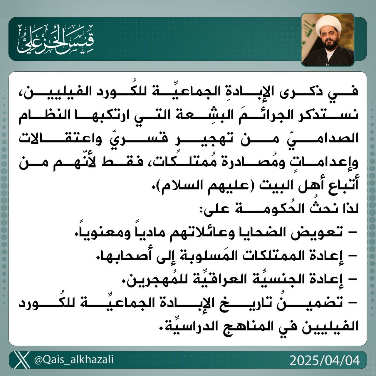 أصدر الأمين العام لحركة عصائب أهل الحق، سماحة الشيخ قيس الخزعلي، بياناً في ذكرى استشهاد المرجع الثائر ورائدِ الصحوة الإسلاميّة الرساليّة، والفيلسوف العظيم آية الله العُظمى السيد الشهيد...