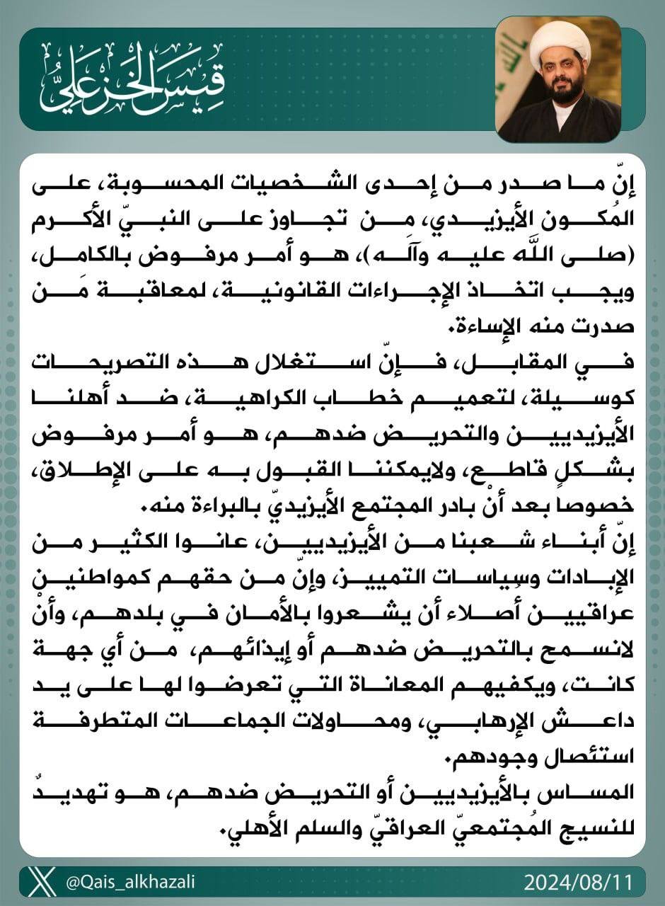 المزيدأستنكر الأمين العام لحركة عصائب أهل الحق ، سماحة الشيخ قيس الخزعلي ، اليوم الأحد، التصريحات المسيئة للرسول الأعظم (صل الله عليه و آله وسلم) من قبل إحدى الشخصيات المحسوبة على المُكون الأيزيدي ،...