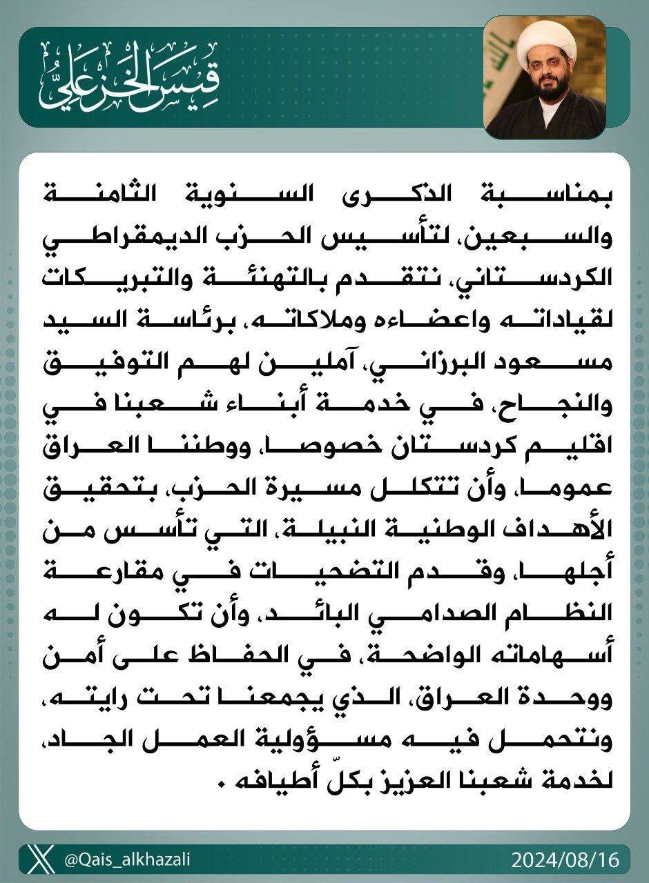 المزيدتقدم الأمين العام لحركة عصائب أهل الحق ، سماحة الشيخ قيس الخزعلي ، اليوم الجمعة ، بالتهاني و التبريكات للحزب الديمقراطي الكردستاني بمناسبة حلول الذكرى السنوية الثامنة والسبعين لتأسيسه...