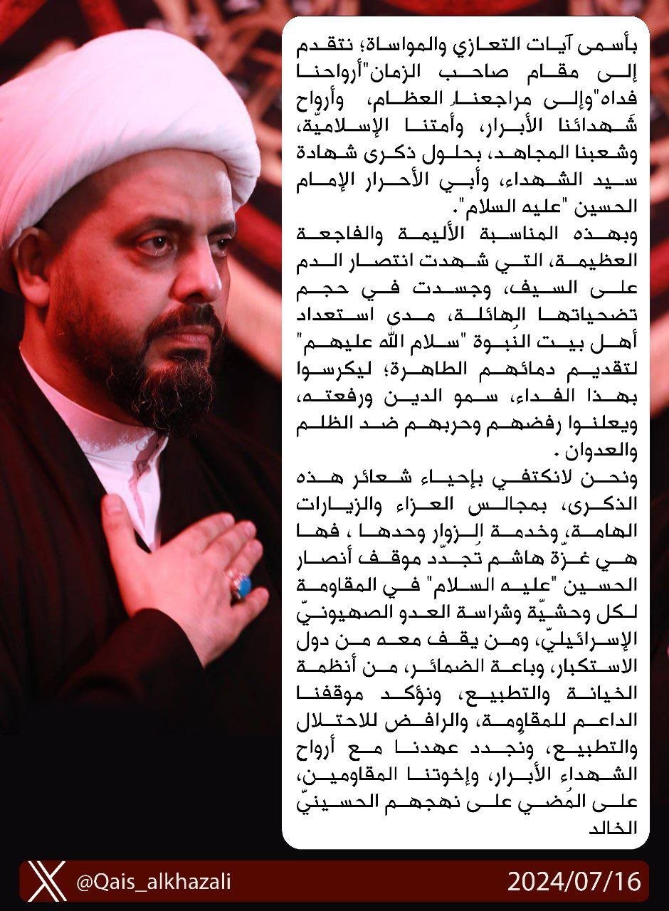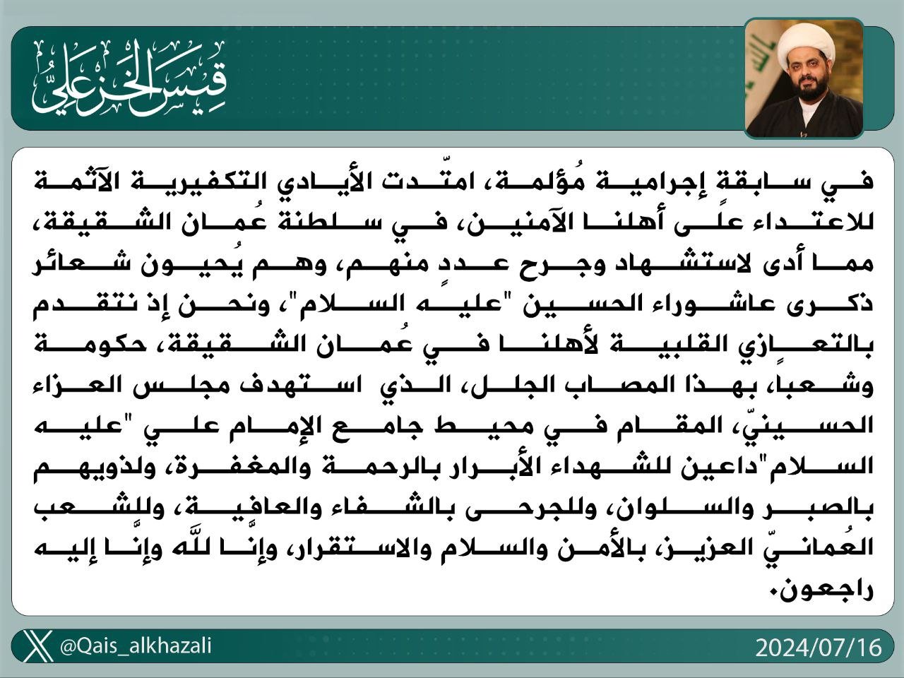 المزيددان الأمين العام لحركة عصائب أهل الحق ، سماحة الشيخ قيس الخزعلي، اليوم الثلاثاء، الأعتداء الأجرامي الذي استهداف مجلس عزاء حسيني في سلطنة عمان، و فيما وصف الأعتداء بأنه سابقة إجرامية مُؤلمة ،...