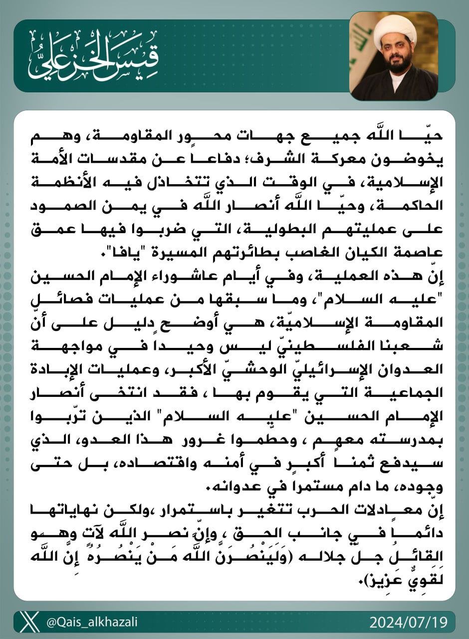 حيّا الأمين العام لحركة عصائب أهل الحق، سماحة الشيخ قيس الخزعلي، اليوم الجمعة، جميع جهات محور المقاومة وعملياتهم البطولية التي ضربت عمق الكيان الصهيوني الغاصب، فيما أكد ان تلك العمليات دليل...