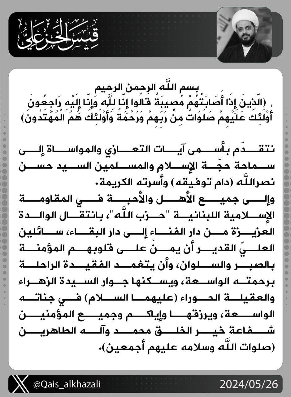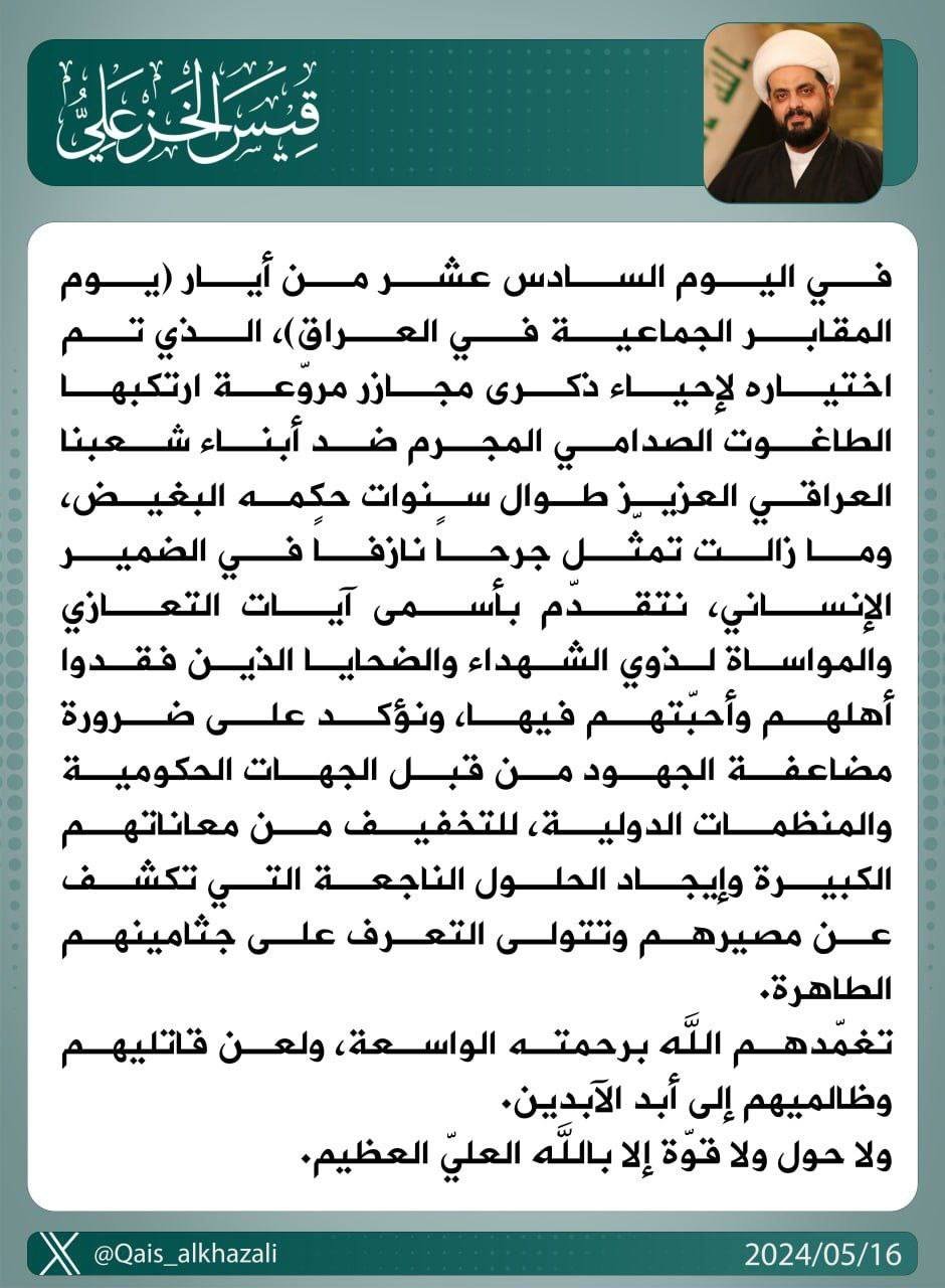 أجرى الأمين العام لحركة عصائب أهل الحق سماحة الشيخ قيس الخزعلي، زيارة تفقدية الى عائلة الشهيد القائد محمد حويش الفريجي، الذي استُشهد أثناء تصديه لقوات الاحتلال الأمريكي، في خطوة تنم عن...