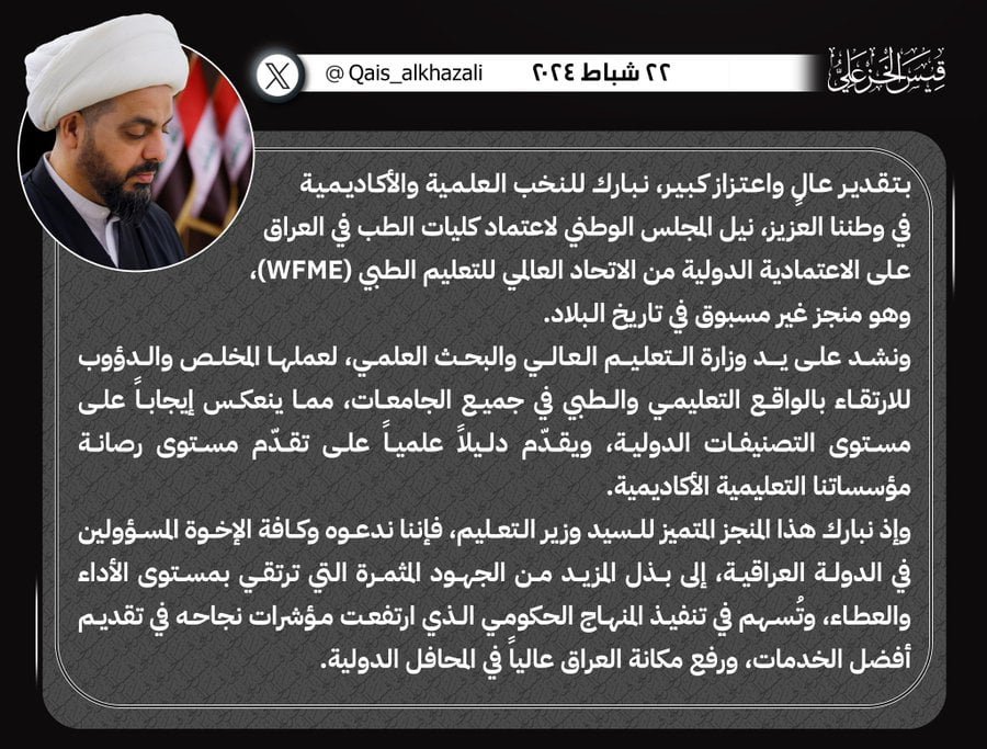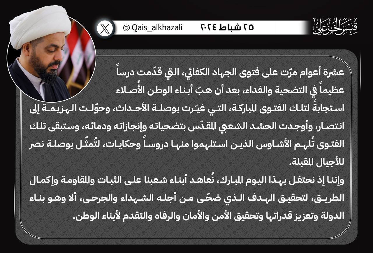 أكد الأمين العام لحركة عصائب أهل الحق سماحة الشيخ قيس الخزعلي، اليوم الأحد ، أن الانتفاضة الشعبانية المباركة، جسّدت بطولات شعبنا العراقي بكل تنوعاته وطبقاته، وإرادته على دحر نظام الطاغية...
