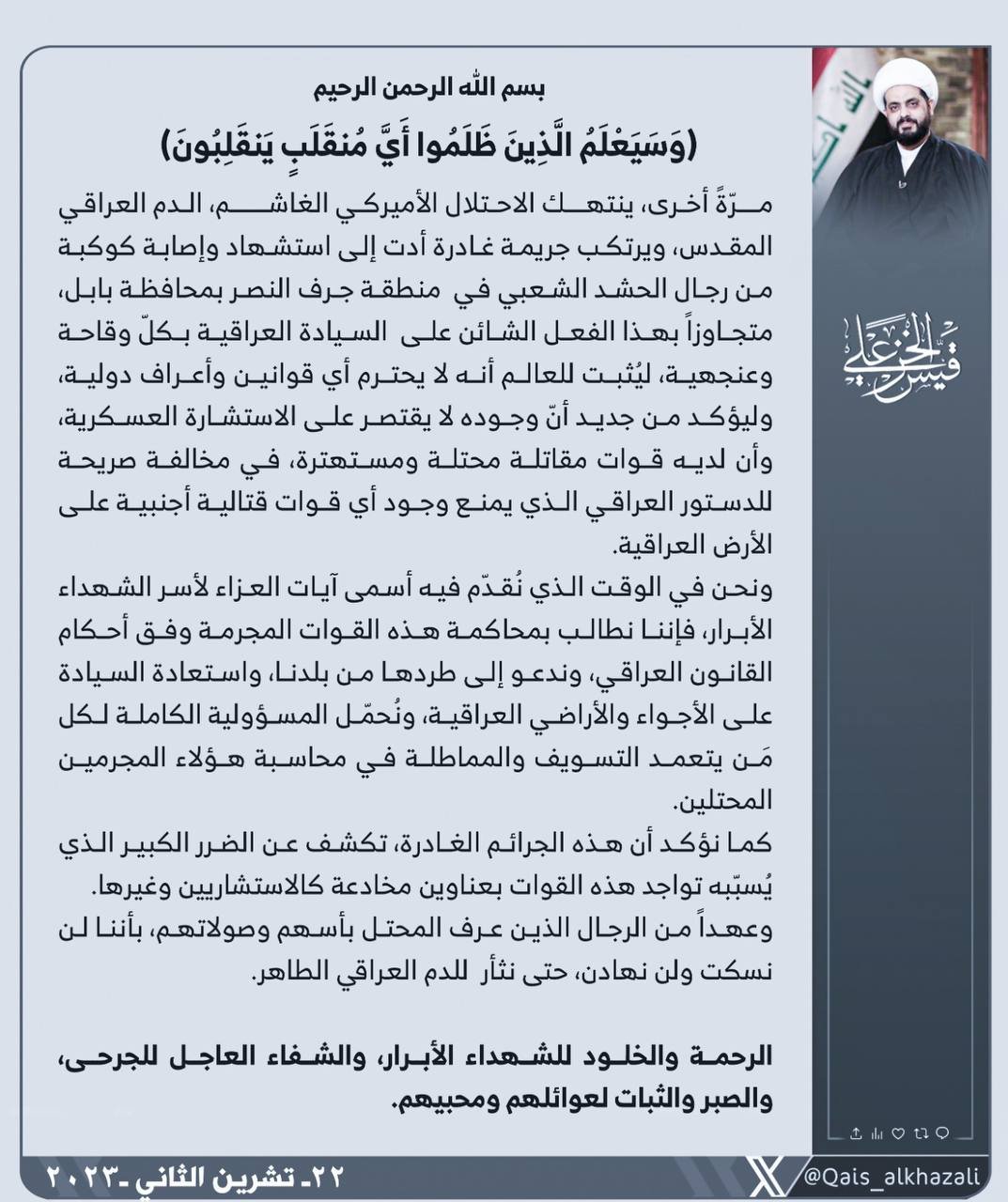المزيدأعتبر الأمين العام لحركة عصائب أهل الحق ، سماحة الشيخ قيس الخزعلي، اليوم الأربعاء، ما يحصل في غزة من جرائم صهيونية وصمة عار بجبين كــــل مـــــن يسكت عــــن الجرائم المرتكبة بحق الشعب...