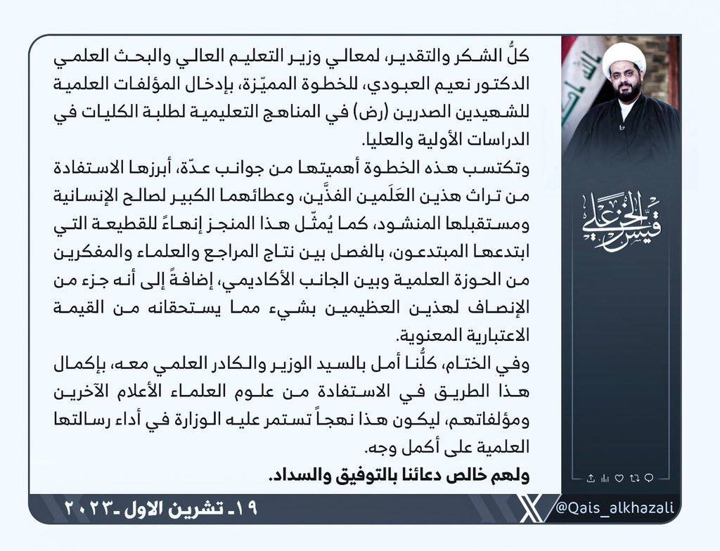 الشيخ الخزعلي يثمن خطوة وزير التعليم بإدخال مؤلفات الشهيدين الصدرين ضمن المناهج التعليمية في الجامعات