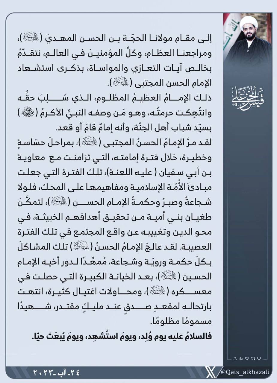 المزيدتقدم الامين العام لحركة عصائب أهل الحق، سماحة الشيخ قيس الخزعلي، اليوم الخميس، بخالص آيات العزاء والمواساة الى مقام الأمام الحجّة بن الحسن ( عج ) و المراجع العظام، وكلّ المؤمنين في العالم،...