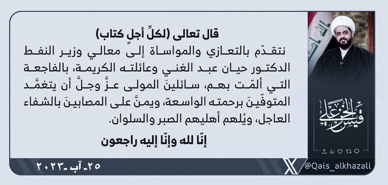 المزيدتقدم الأمين العام لحركة عصائب أهل الحق، سماحة الشيخ قيس الخزعلي ، اليوم الجمعة ، بالتعزية إلى وزير النفط حيان عبد الغني بما تعرضت له أسرته من مأساة بسبب حادث مروري تعرضوا له، أدى إلى وفاة...
