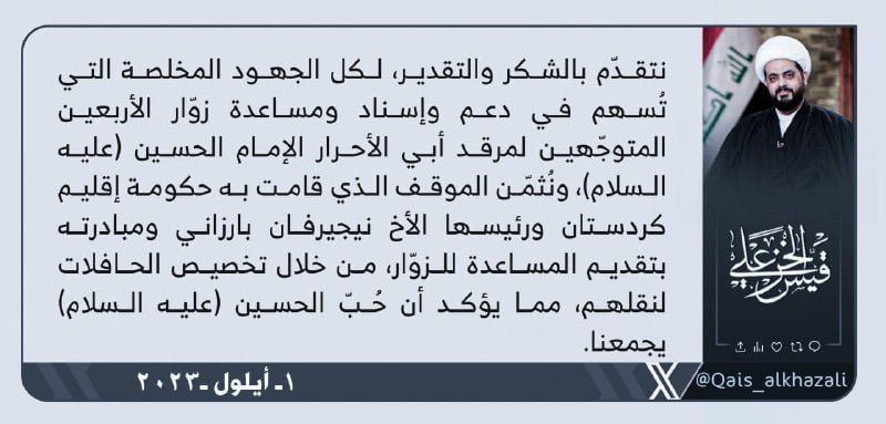 المزيدتقدم الأمين العام لحركة عصائب أهل الحق ، سماحة الشيخ قيس الخزعلي ، اليوم الجمعة ، بالشكر و التقدير لجميع الجهود المخلصة التي ساهمت في دعم و أسناد زوار الأربعين المتوجهين المتوجهين الى كربلاء...