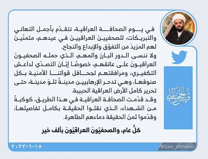 إستقبل الأمين العام لحركة عصائب أهل الحق سماحة الشيخ قيس الخزعلي، بمكتبه في بغداد، اليوم الأحد، رئيس الكتلة التركمانية ولجنة حقوق الانسانالنيابية النائب أرشد الصالحي. و ذكر بيان للمكتب...