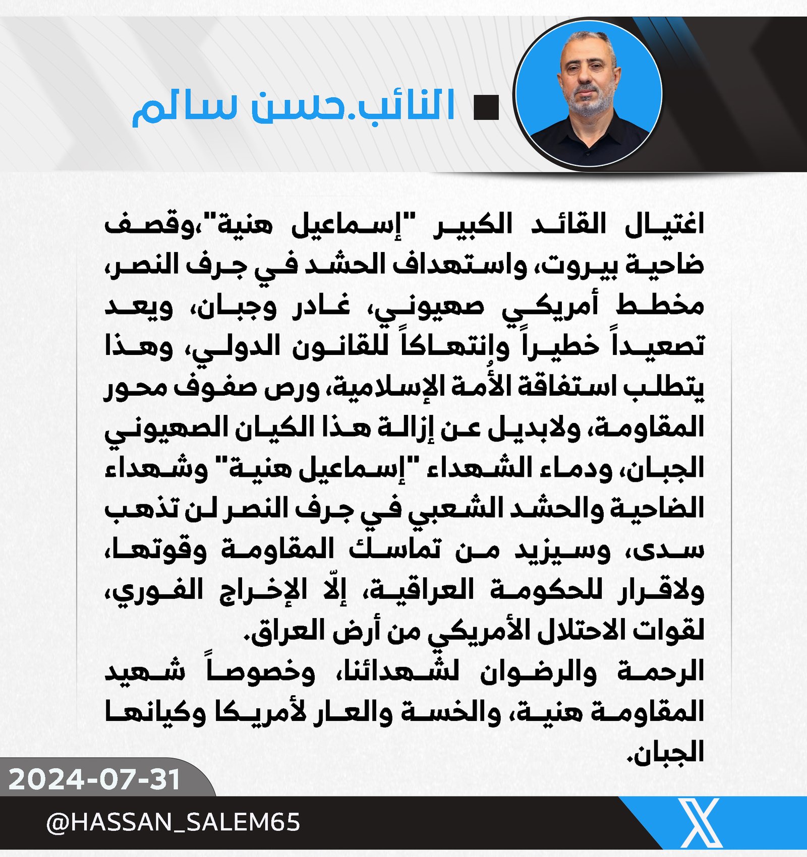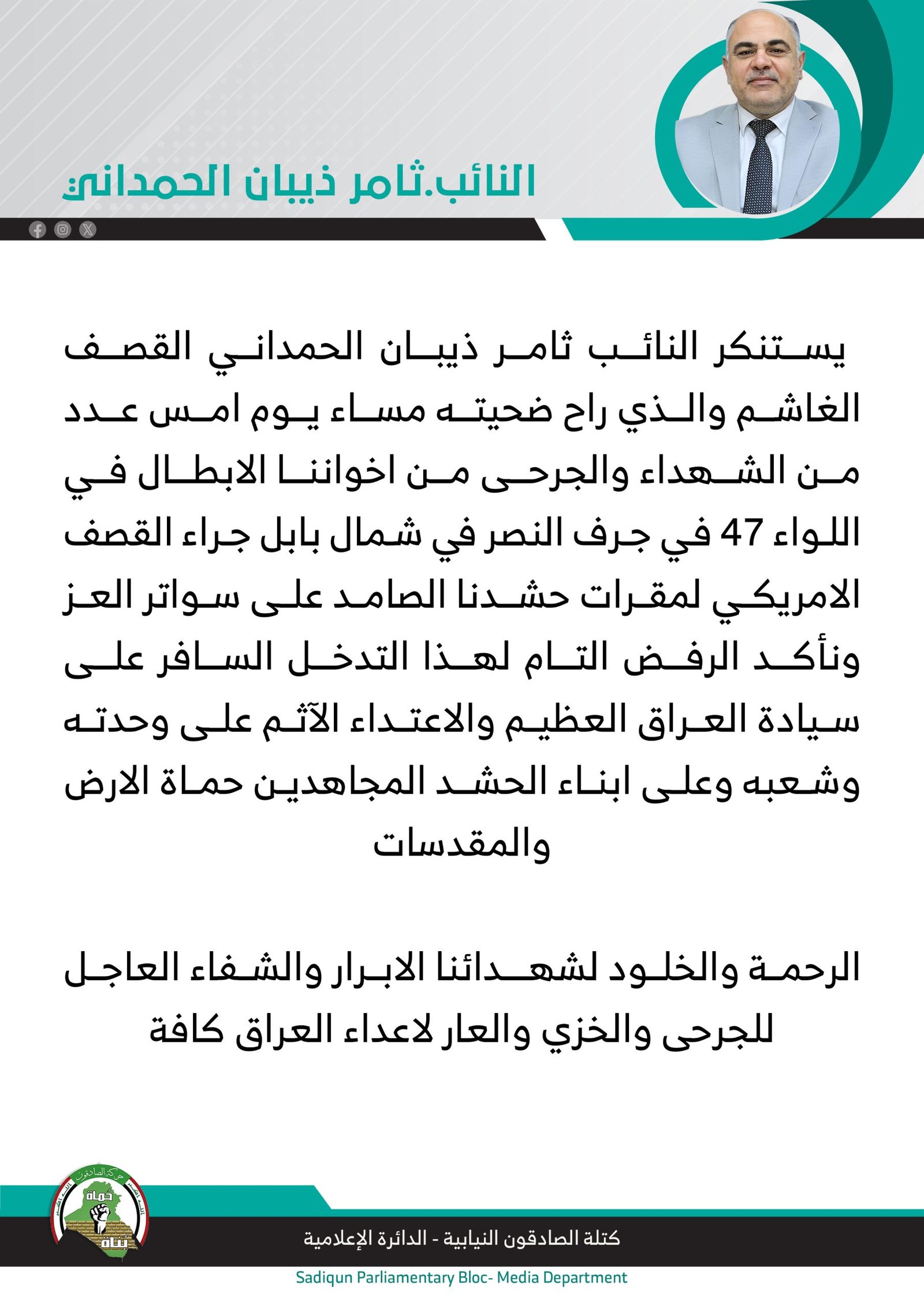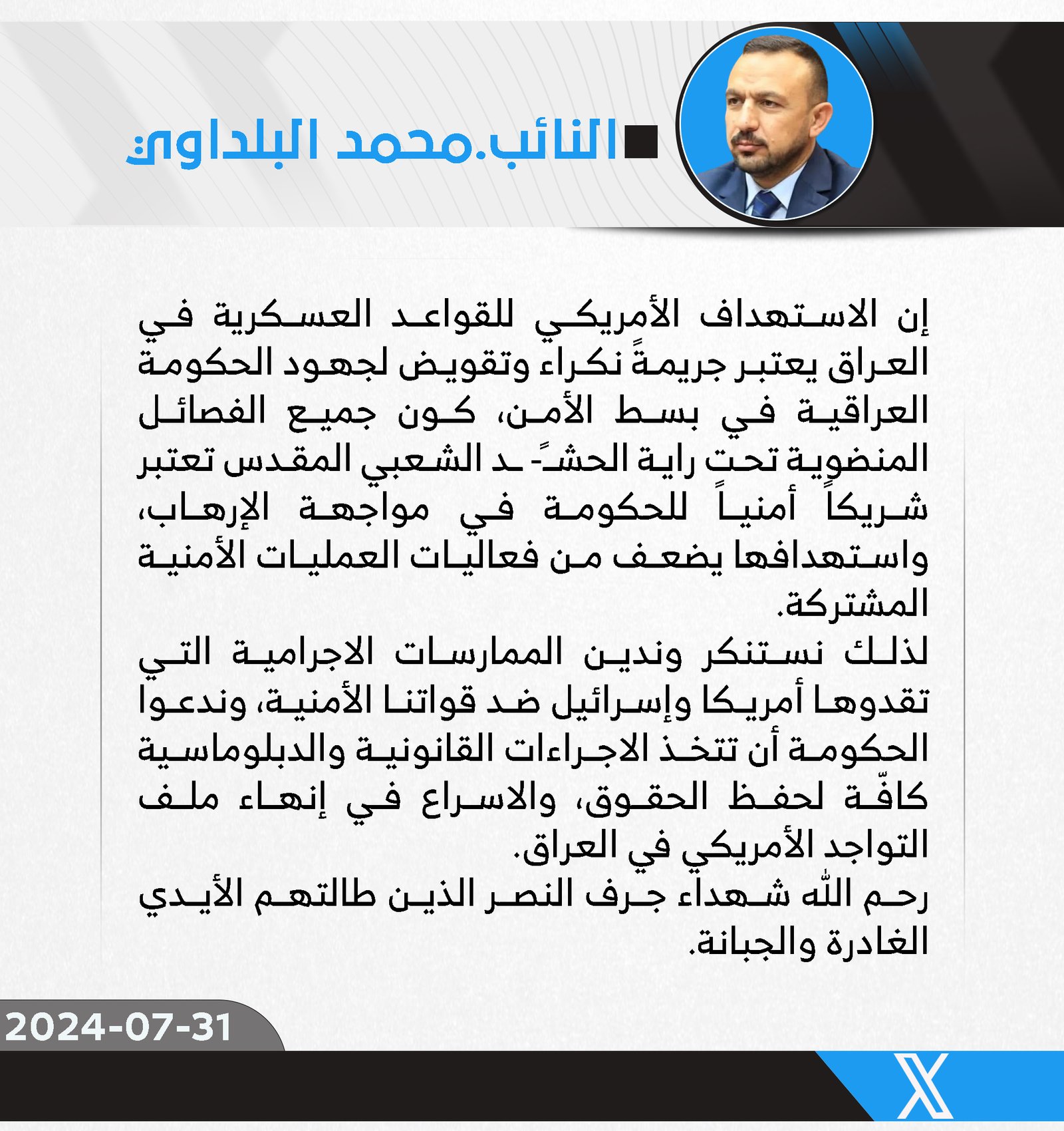 البلداوي: الأستهداف الأمريكي لمواقع الحشد الشعبي جريمةً نكراء وتقويض لجهود الحكومة في بسط الأمن