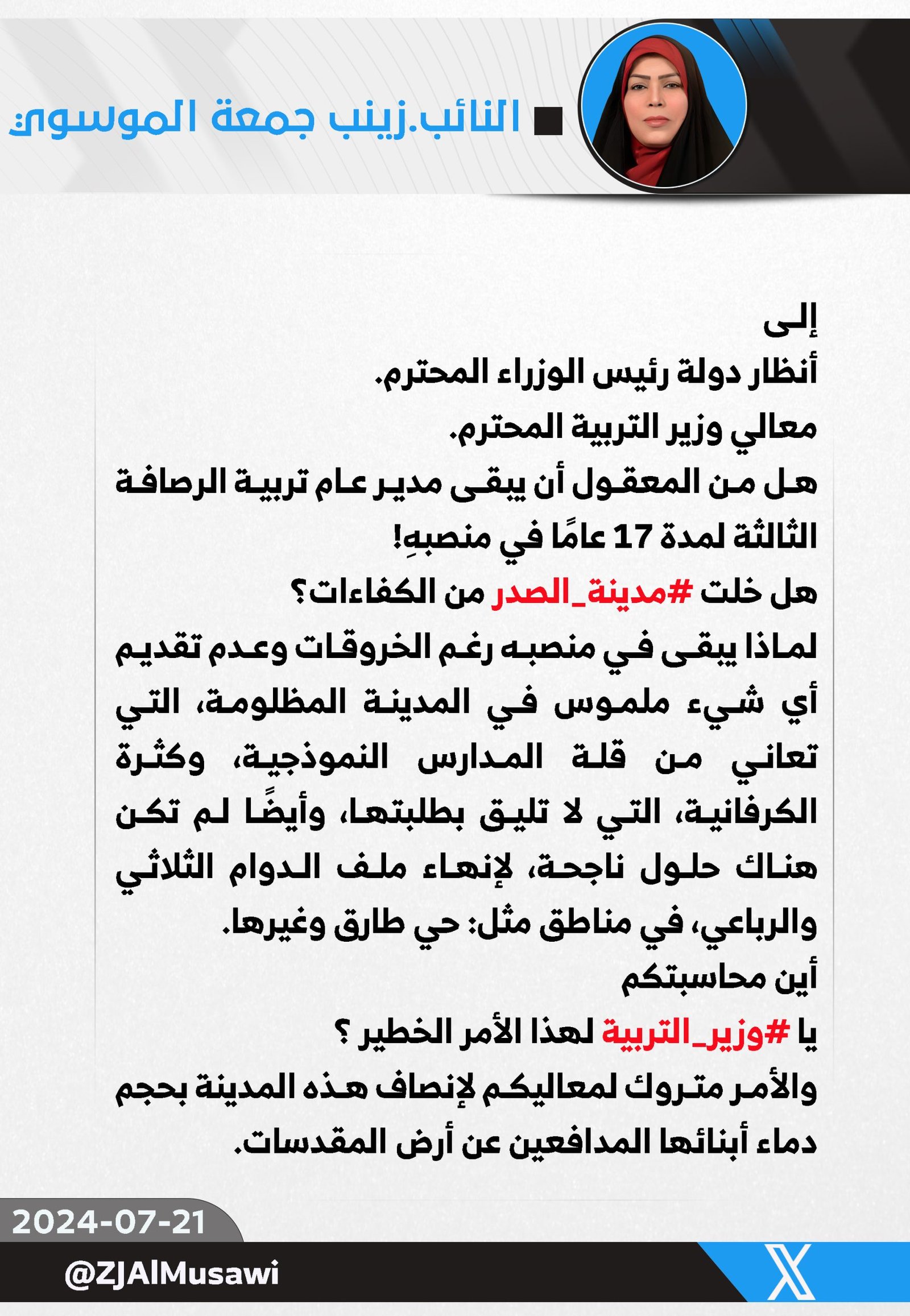 مطالبة بتغييره .. الموسوي: تحمل مدير تربية الرصافة الثالثة مسؤولية فشل العملية التربوية في مدينة الصدر