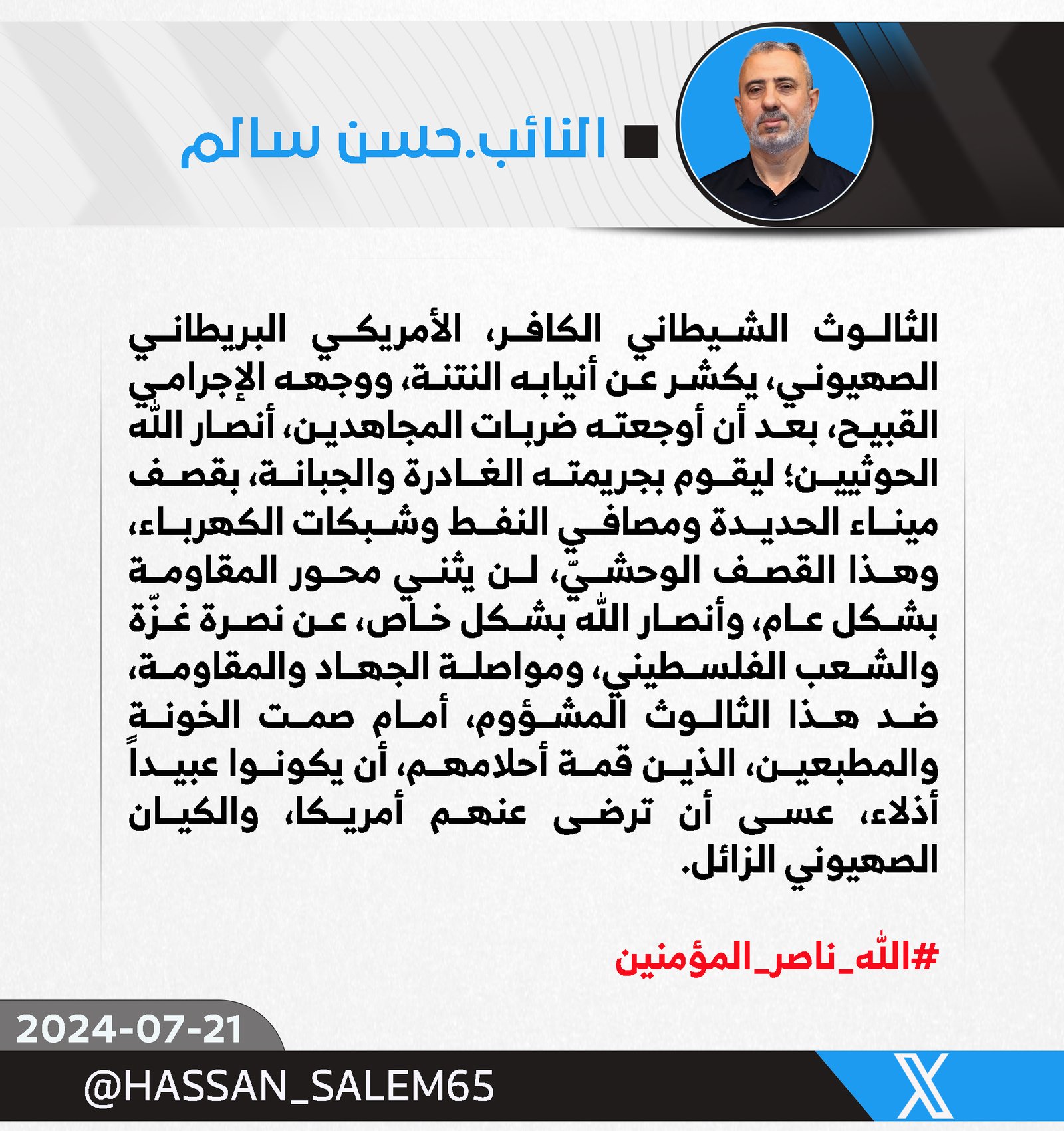 أستنكر رئيس لجنة الشهداء والضحايا والسجناء السياسيين النيابية، حسن سالم ، اليوم الأحد، القصف الصهيوني الذي طال البنى التحتية و ميناء الحديدة اليمني ، مؤكدا ان هذا الأعتداء جاء نتيجة...