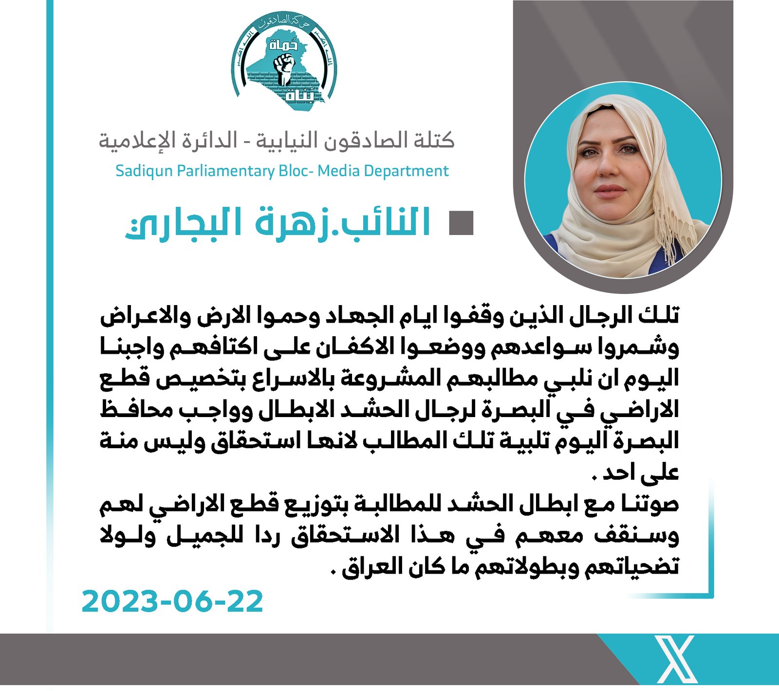 دعت رئيس لجنة النقل والاتصالات البرلمانية عن كتلة الصادقون ، النائب زهرة البجاري، اليوم السبت، الحكومة المحلية في البصرة الى الأستجابة لمطالب أبناء الحشد الشعبي المشروعة في تخصيص قطع اراضي...