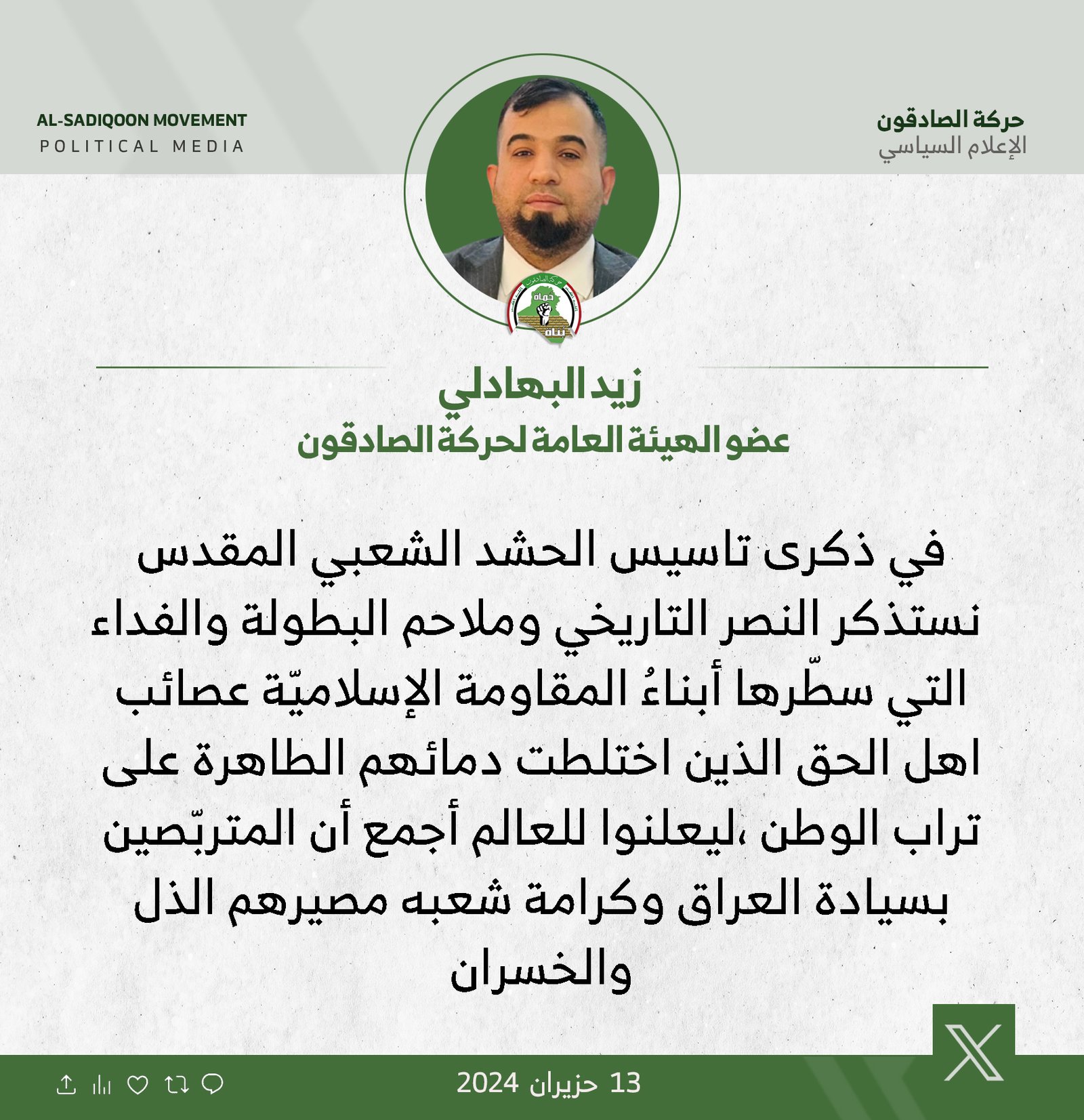 في ذكرى تأسيس الحشد .. البهادلي: نستذكر النصر التاريخي وملاحم البطولة التي سطّرها أبناءُ عصائب اهل الحق الذين اختلطت دمائهم الطاهرة على تراب الوطن 120 ... المزيد