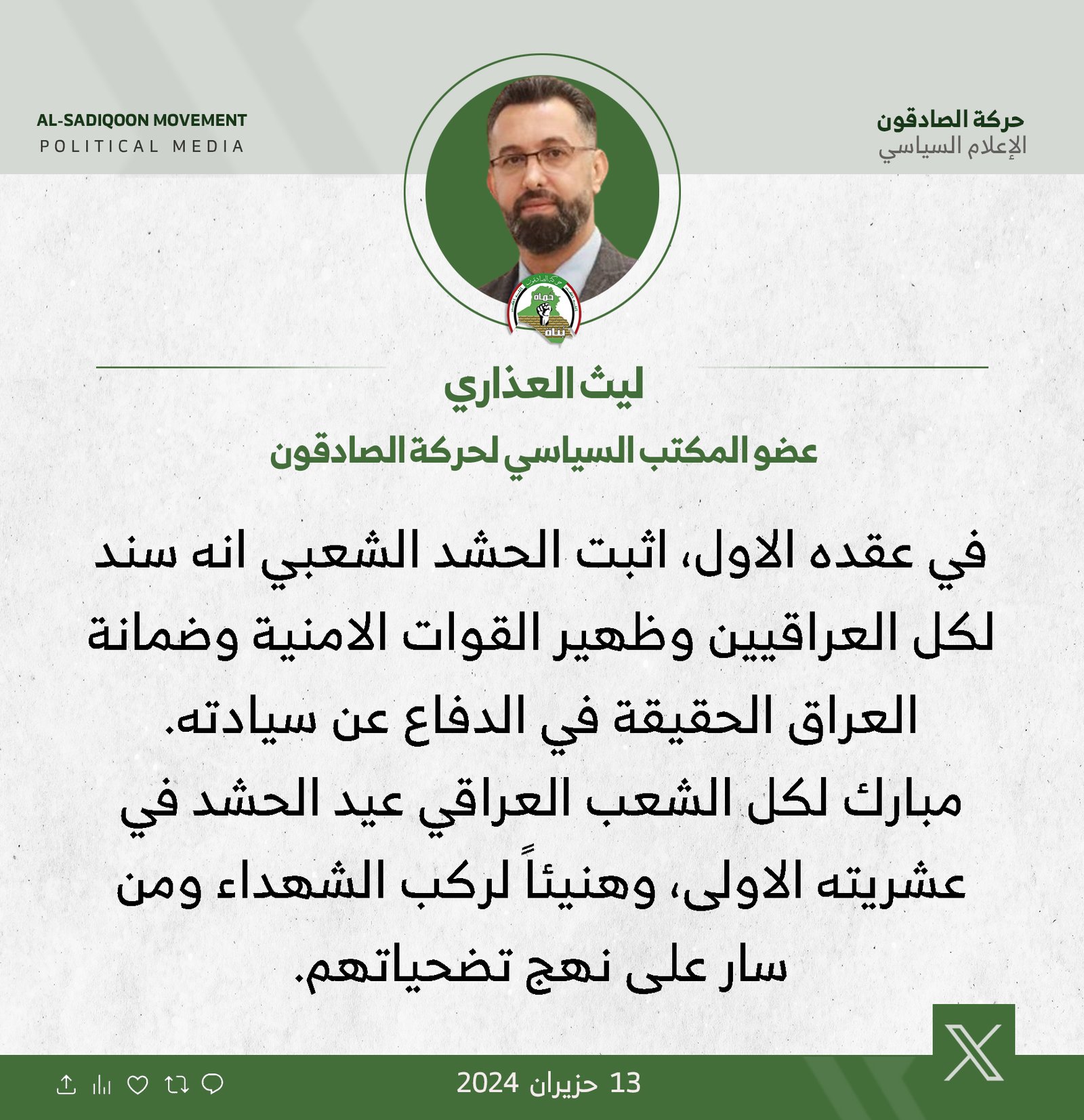 سالم مهنئاً بعيد الحشد .. جاء بفتوى مباركة مكوناً حشود ضاربة قوية الايمان والعقيدة مستعدة للتضحية من اجل الوطن والمقدسات 125 ... المزيد