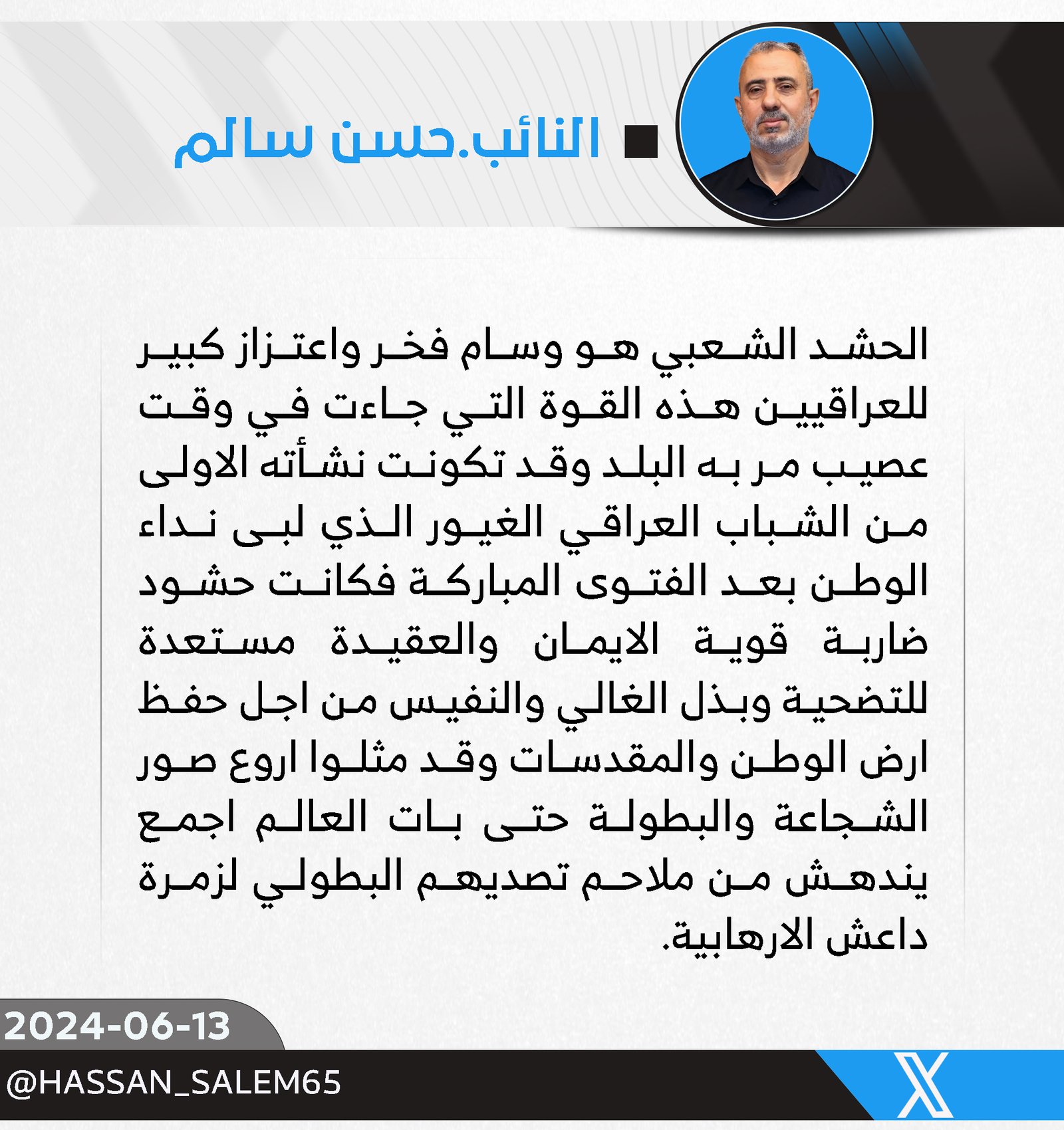 في ذكرى تأسيسه .. الحلاوي: الحشد الشعبي أصبح قوة عسكرية ضاربة يشهد لها الجميع بالبسالة والتضحية 131 ... المزيد