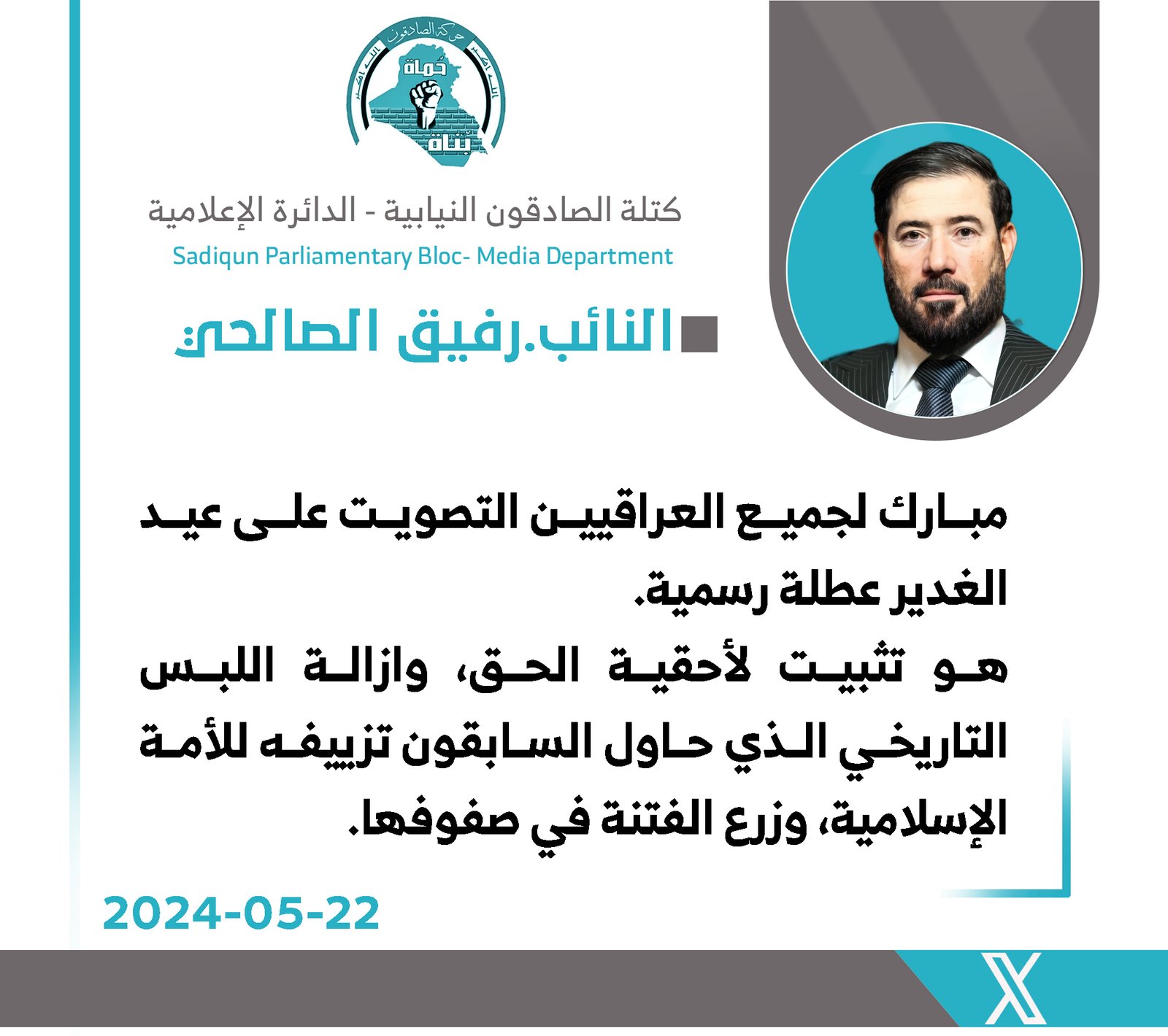 أكد المتحدث بإسم كتلة الصادقون، محمد البلداوي، اليوم الأربعاء، إن البرلمان مستمر في أعماله وأداء مهامه التشريعية والرقابية بالرغم من عدم انتخاب رئيس جديد . وقال البلداوي، إن" قرار المحكمة...