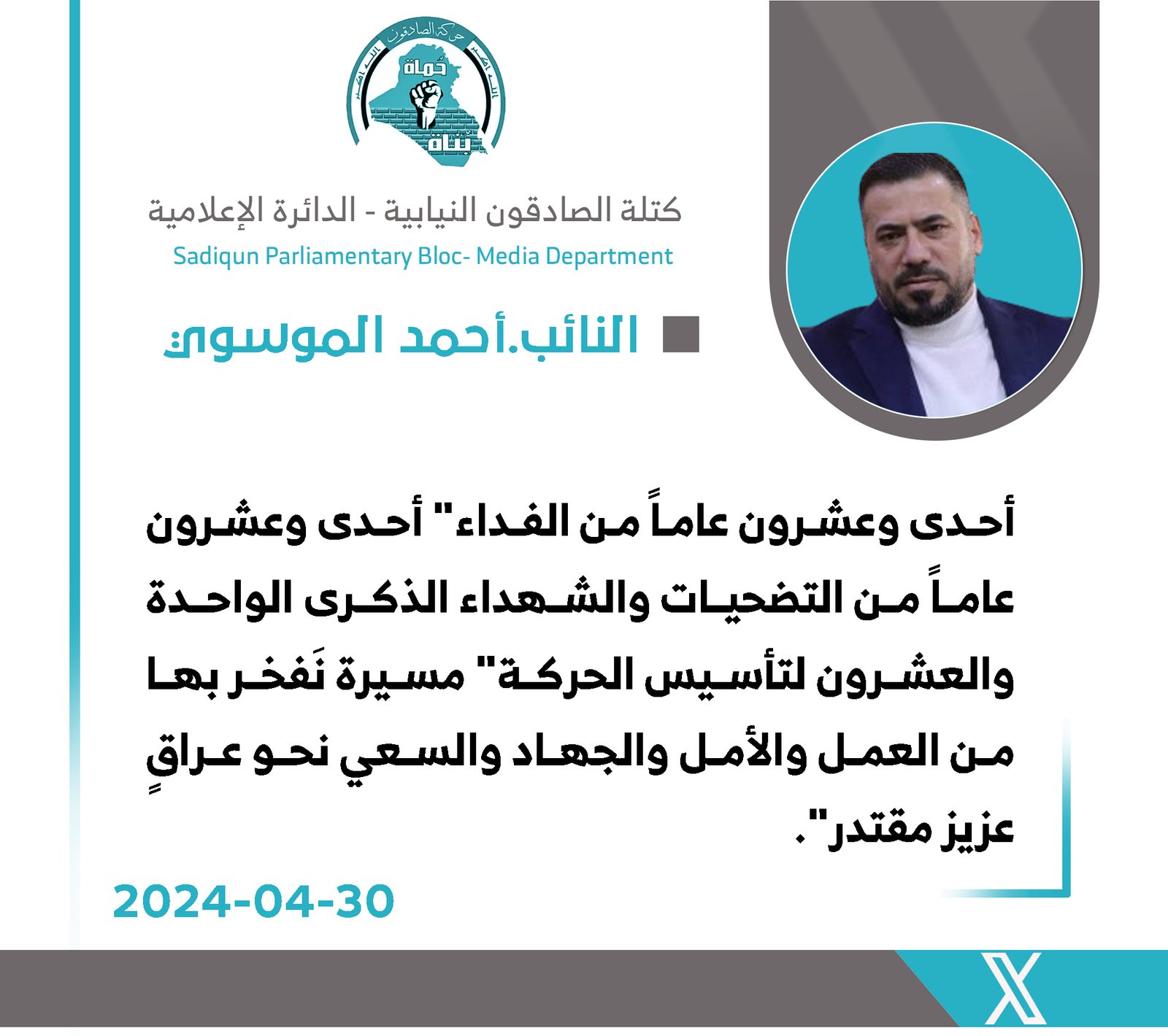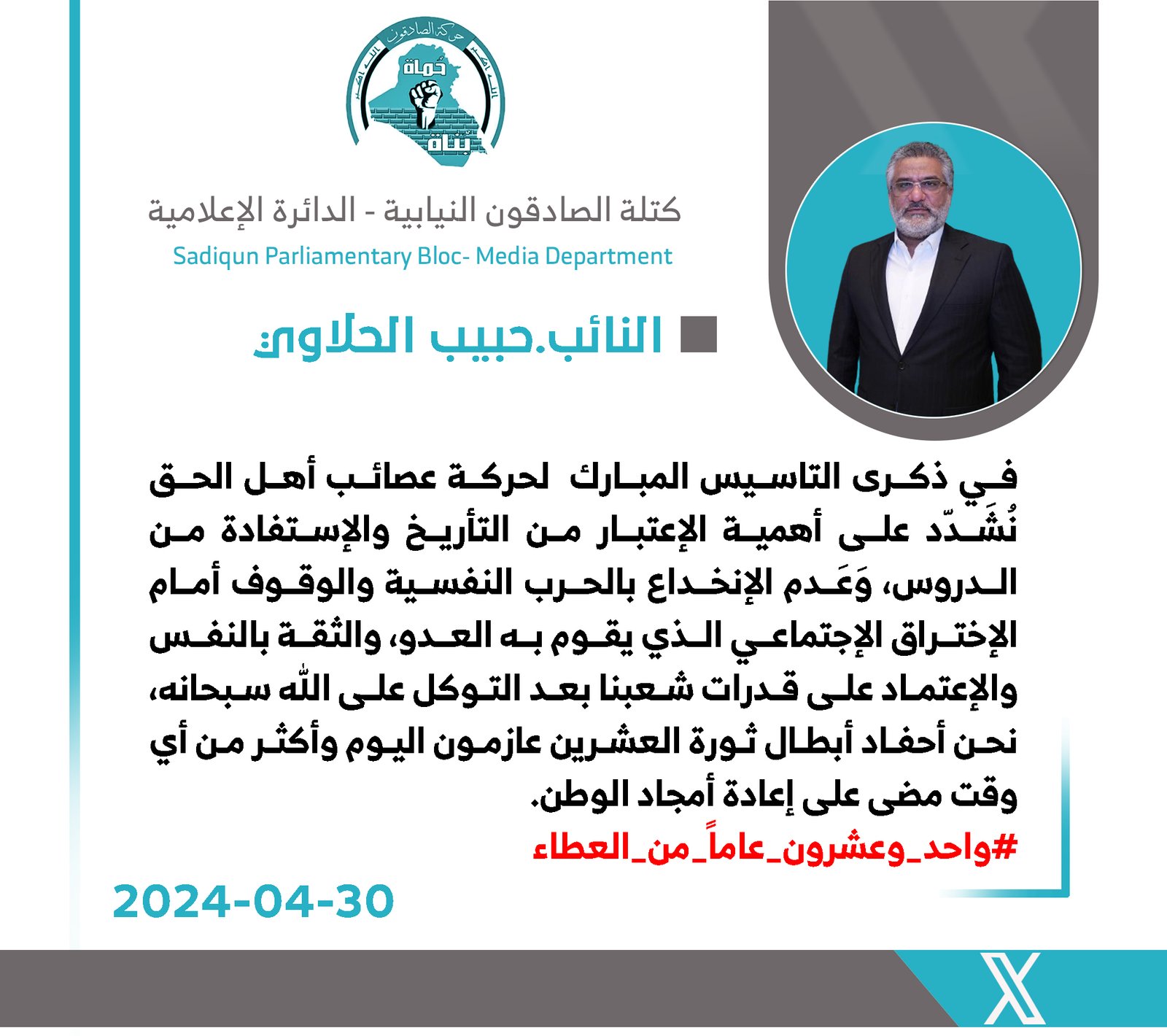 شدد رئيس كتلة الصادقون النيابية ، النائب حبيب الحلاوي، اليوم الثلاثاء، على أهمية الإعتبار من التأريخ والإستفادة من الدروس، وَعَدم الإنخداع بالحرب النفسية و الإختراق الإجتماعي الذي يقوم به...