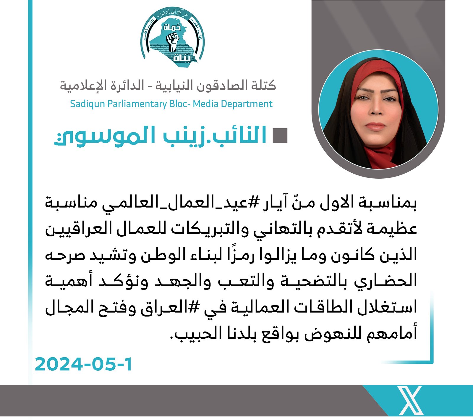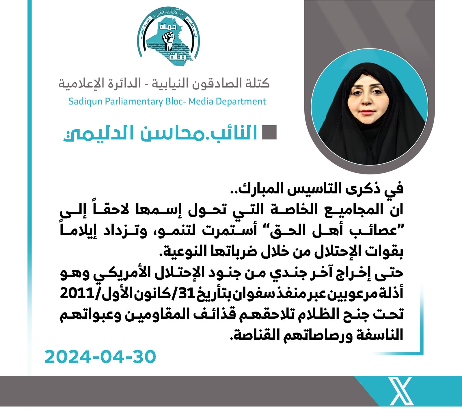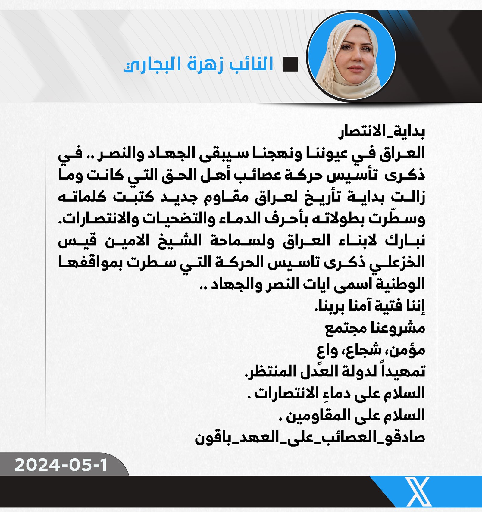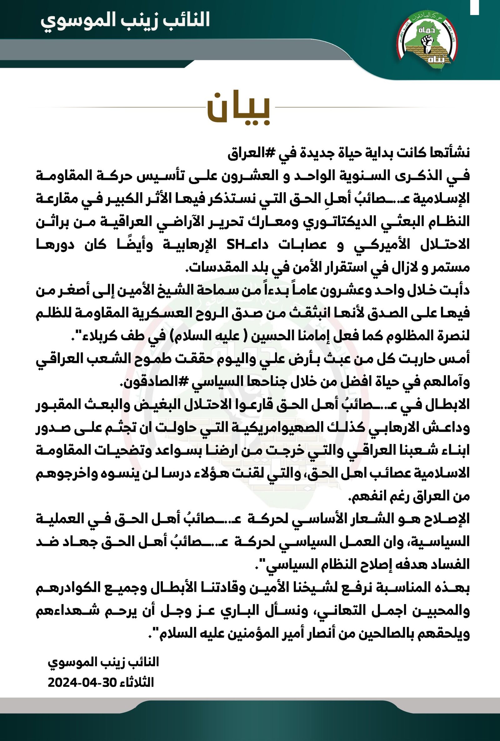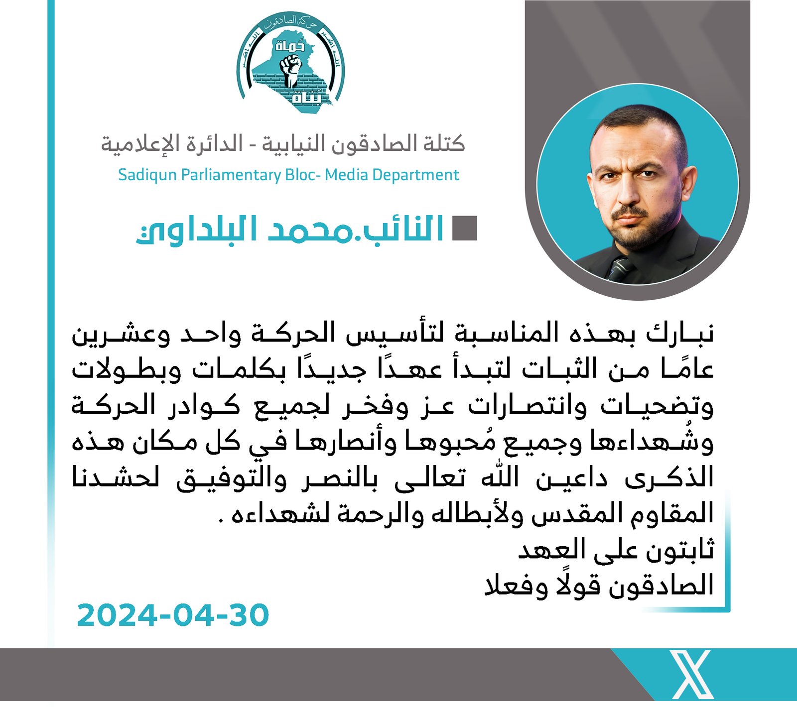 المزيدأصدرت النائب عن كتلة الصادقون ، زينب الموسوي، اليوم الثلاثاء ، بيانا بمناسبة الذكرى الـ21 لتأسيس حركة عصائب أهل الحق ، أستذكرت خلاله المسيرة المشرفة للحركة في مواجهة الأحتلال و الأرهاب و...