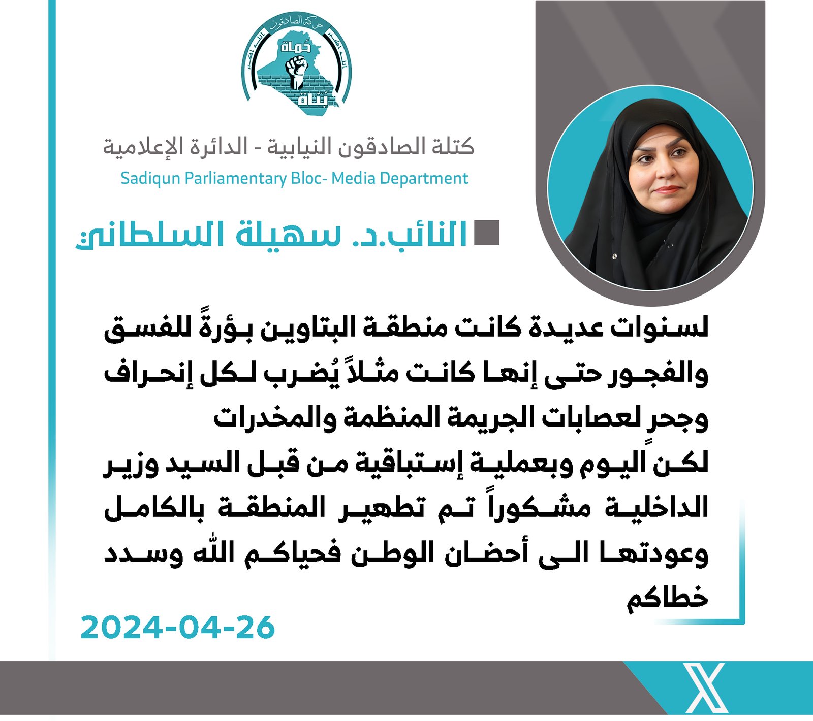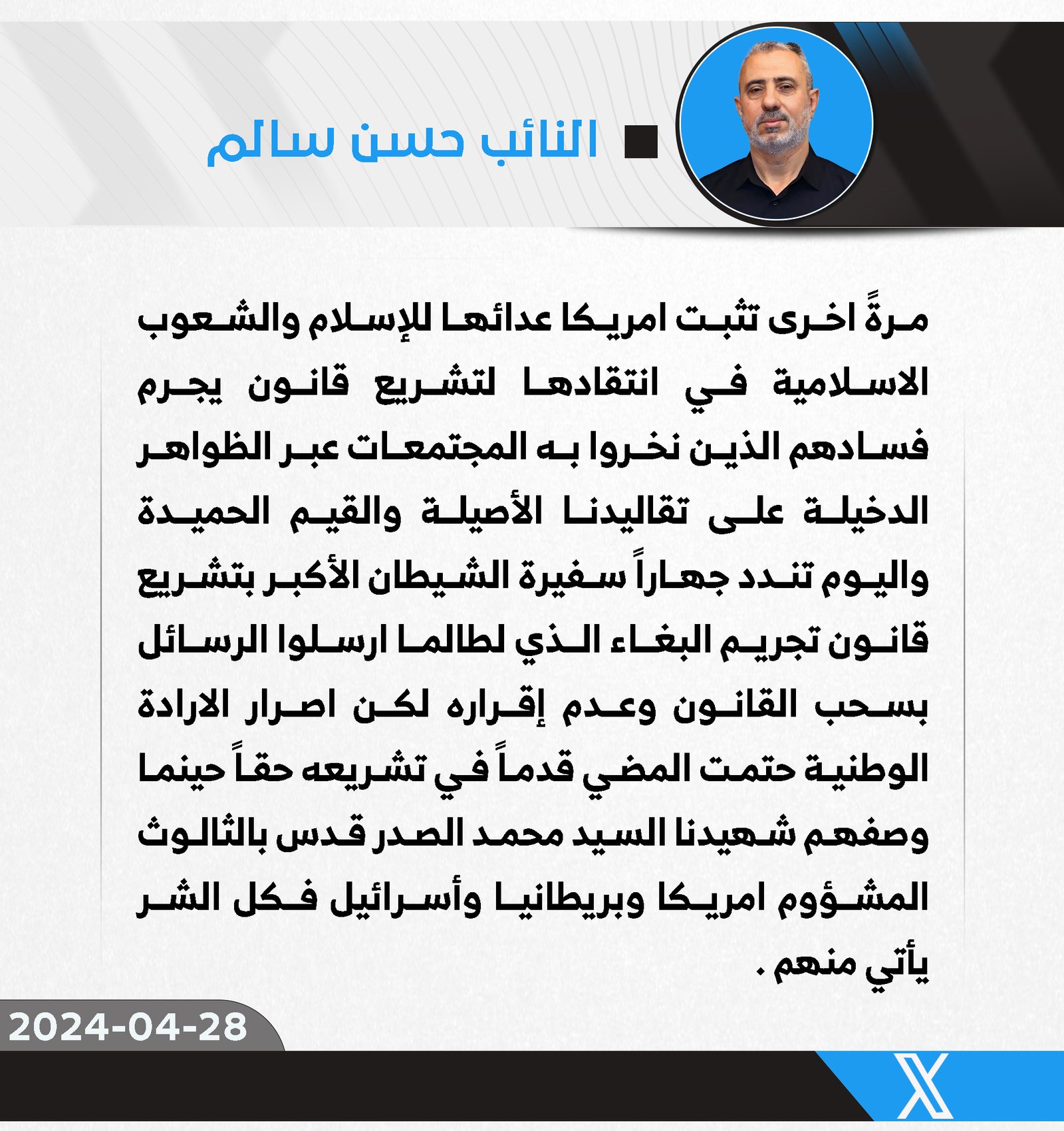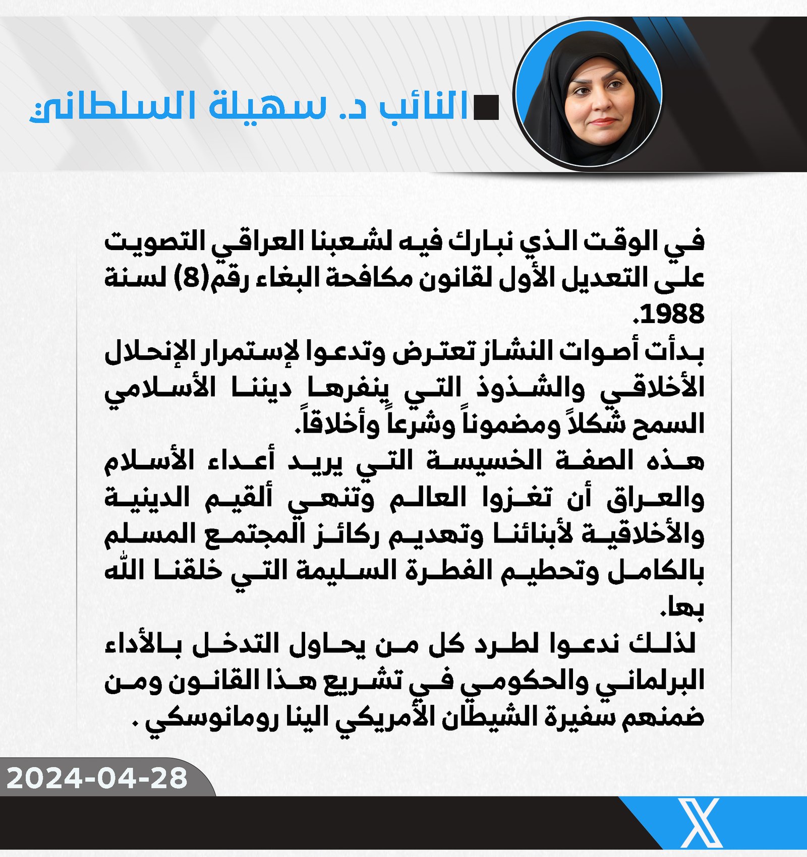 سالم ينتقد تدخلات السفيرة الأمريكية في الشأن العراقي و تنديدها بتشريع قانون تجريم البغاء