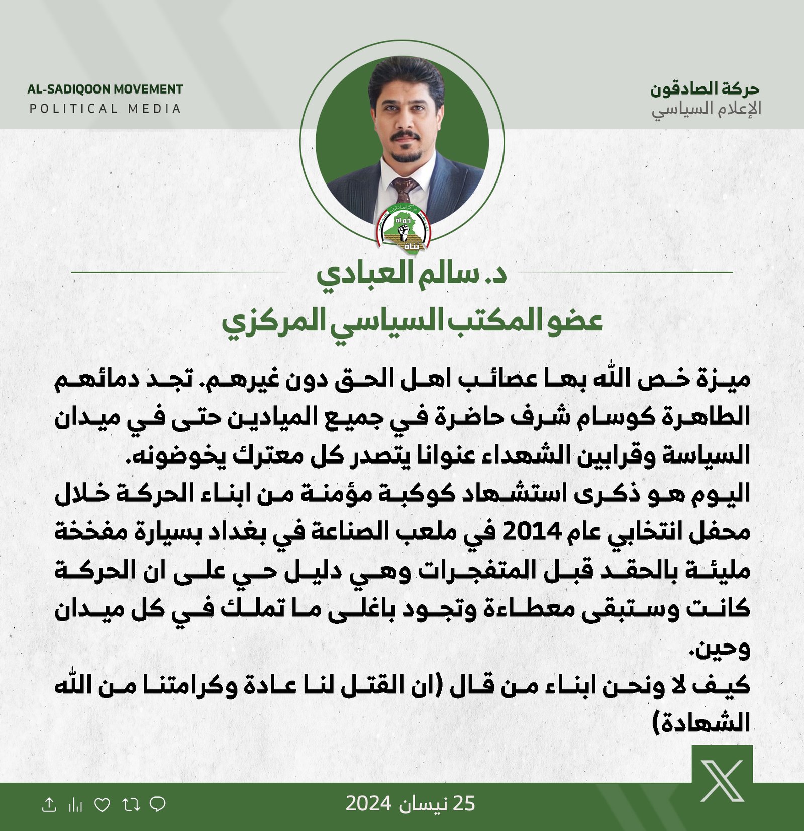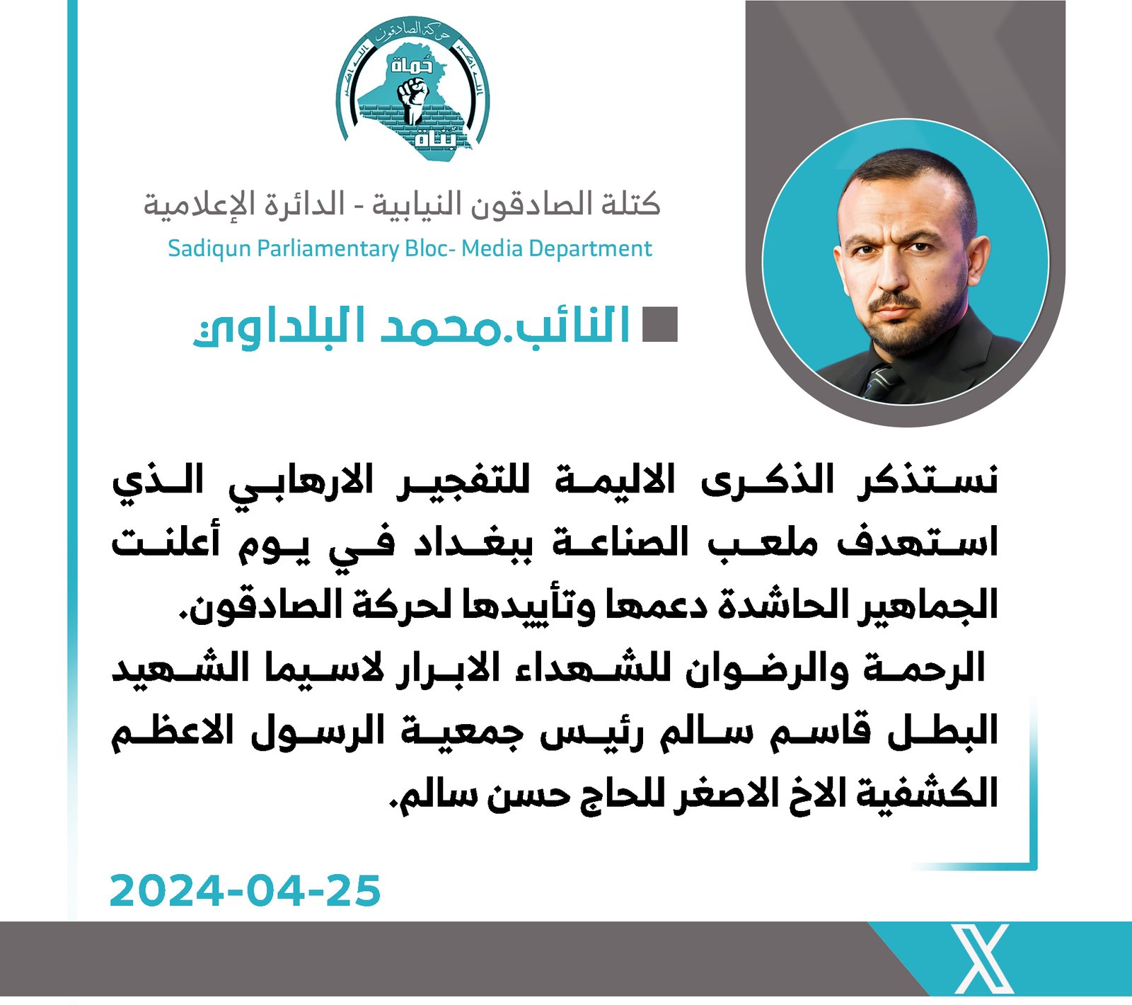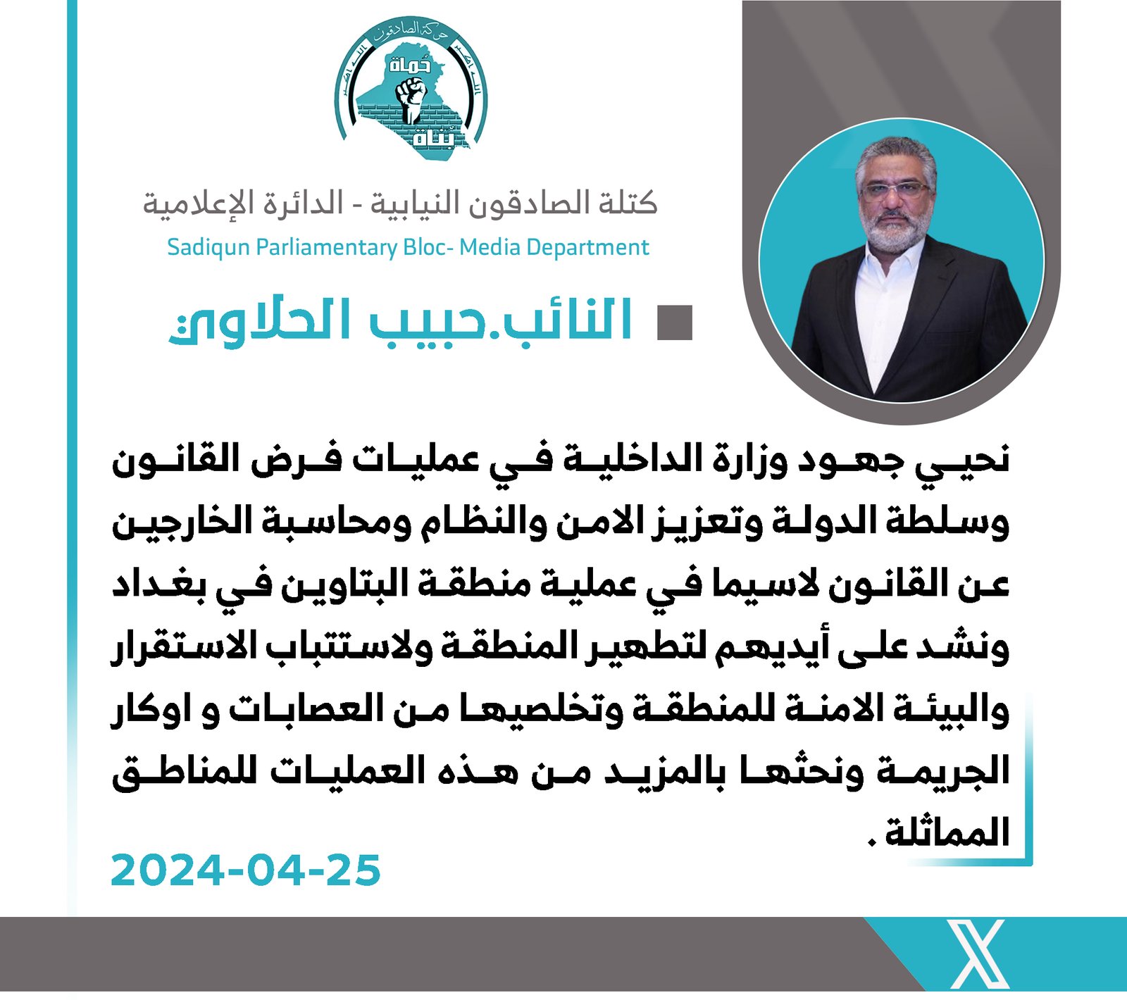 ثمن رئيس كتلة الصادقون النيابية، حبيب الحلاوي، اليوم الخميس، جهود وزارة الداخلية في فرض القانون وتعزيز الامن في مناطق العاصمة، داعيا الى تكثيف عملياتها للقضاء على العصابات و اوكار الجريمة...