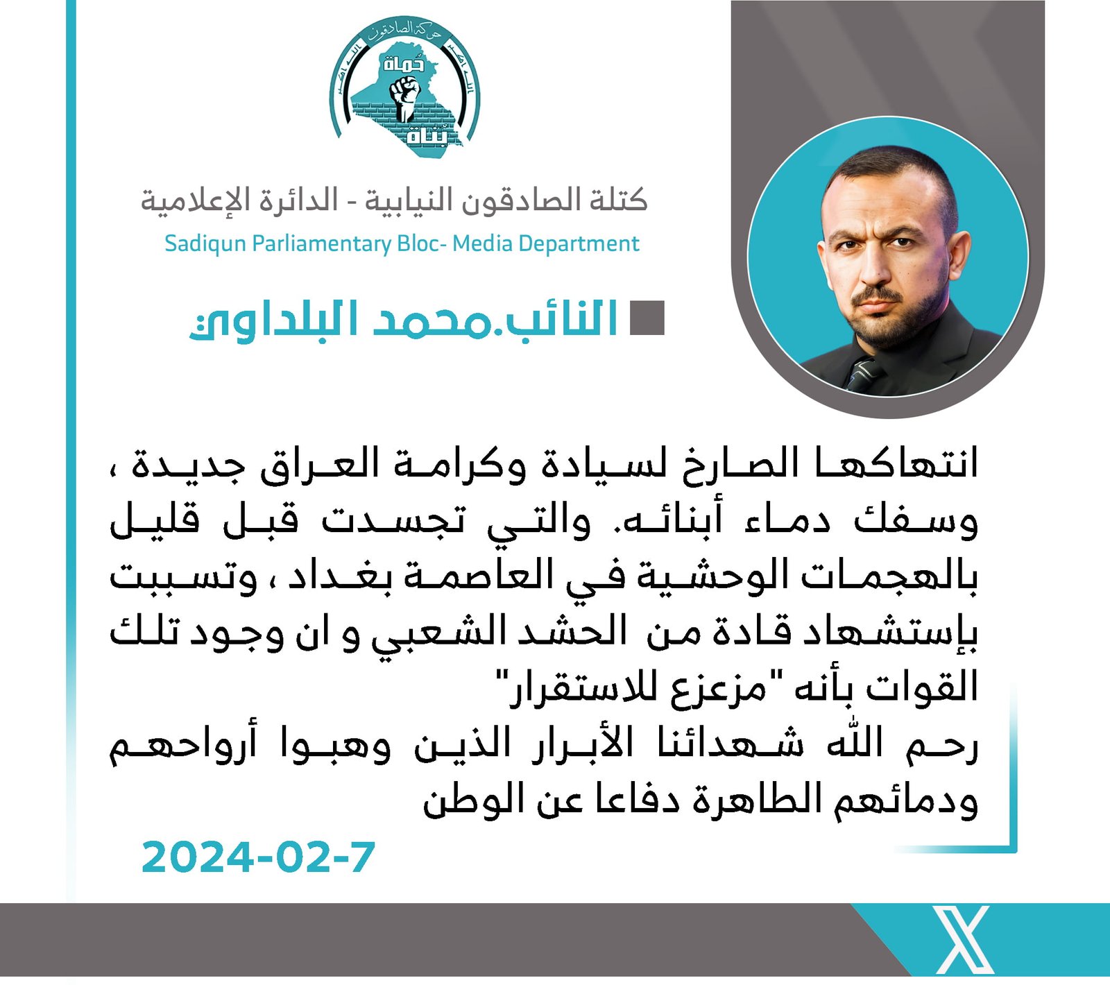البلداوي: تنسيقية المقاومة تجري اتصالات مكثفة للرد على العدوان الأمريكي الذي طال قيادات في الحشد الشعبي
