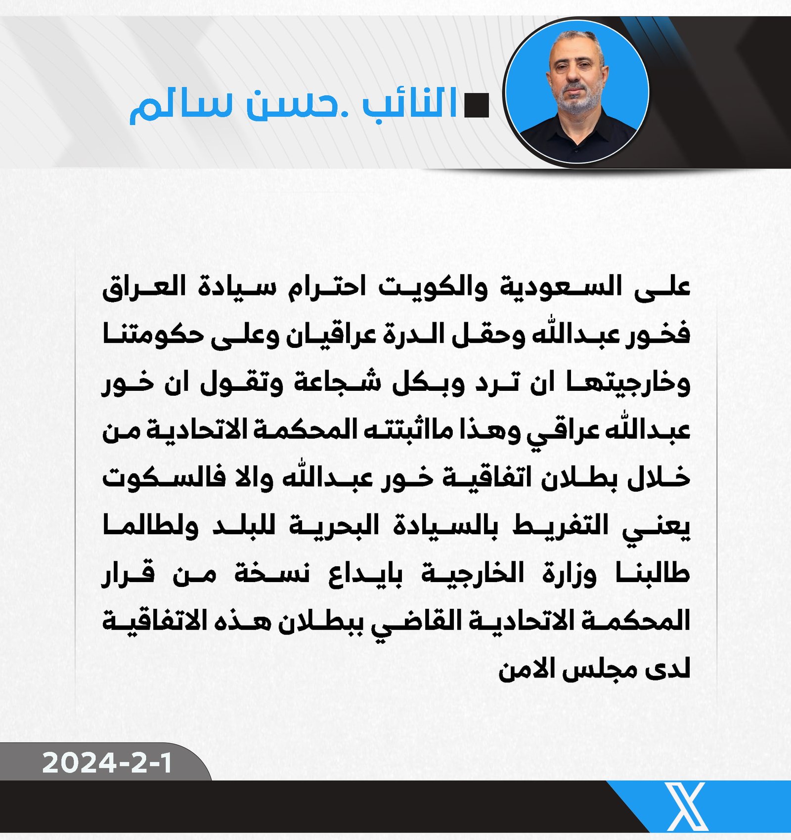 سالم يكشف عن جمع تواقيع نيابية لمطالبة الخارجية بايداع قرار بطلان اتفاقية خور عبد الله لدى مجلس الامن