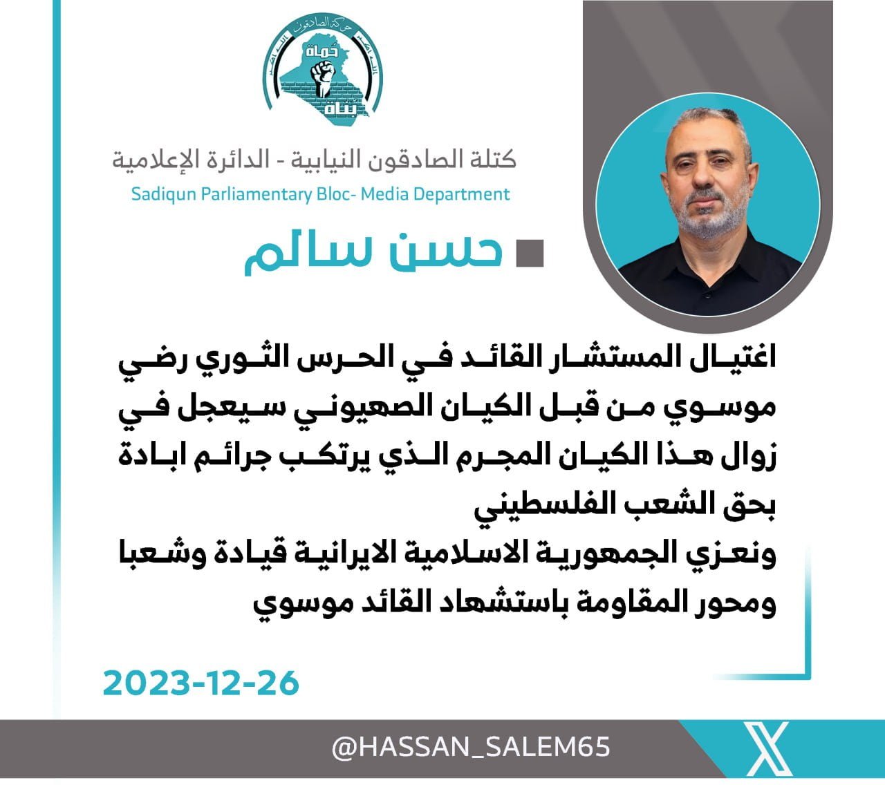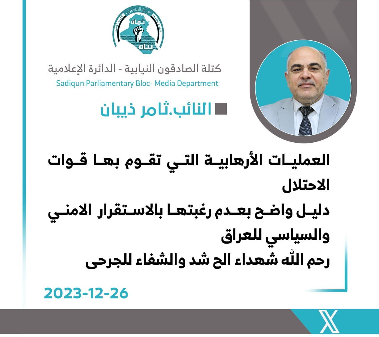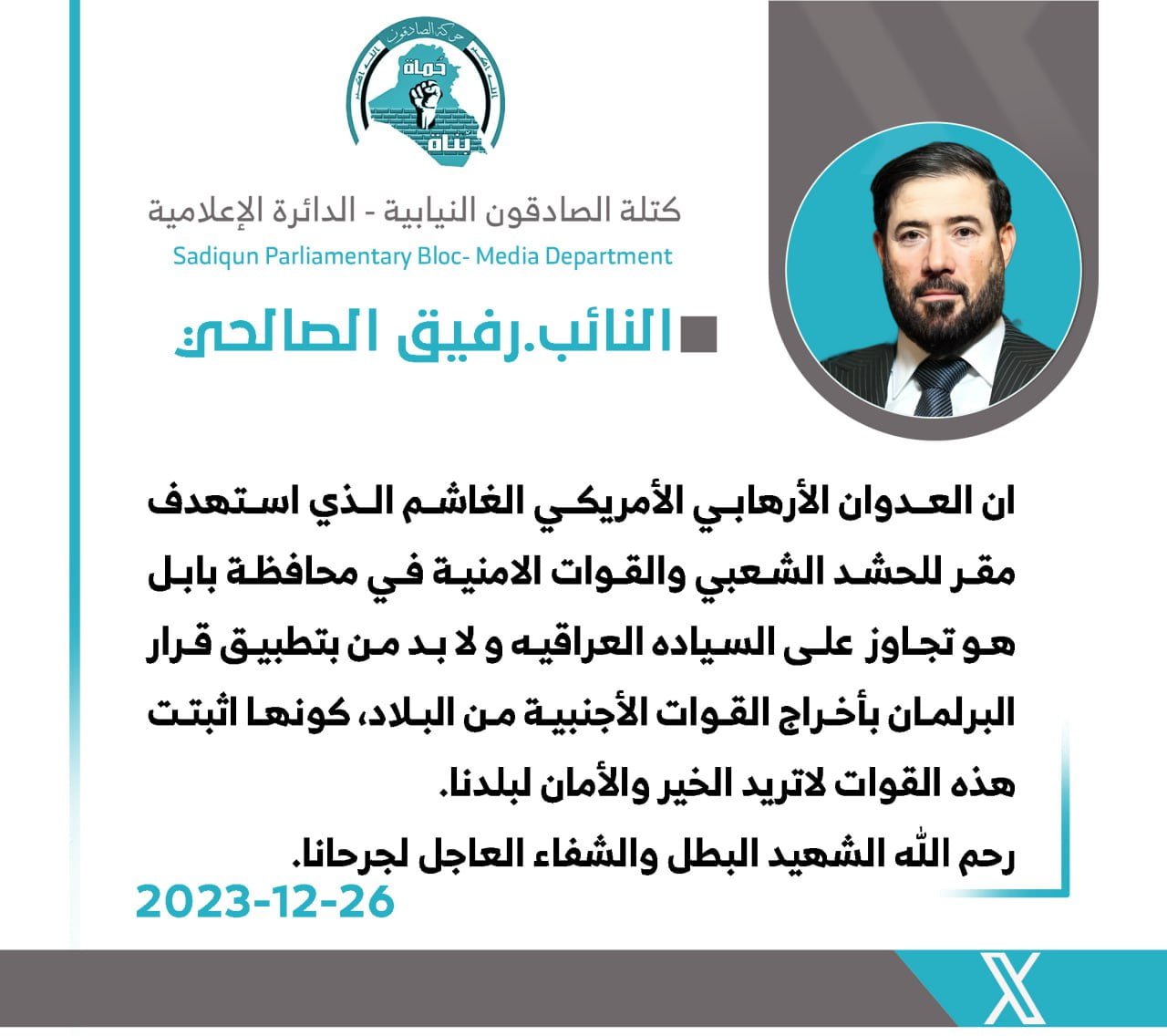 المزيددعا النائب عن كتلة الصادقون ، احمد الموسوي، اليوم الثلاثاء ، الى موقف حكومي حازم للرد على الأعتداءات الأمريكية و أنتهاك سيادة البلاد و المواثيق الدولية . و قال الموسوي، في تدوينة على موقع...