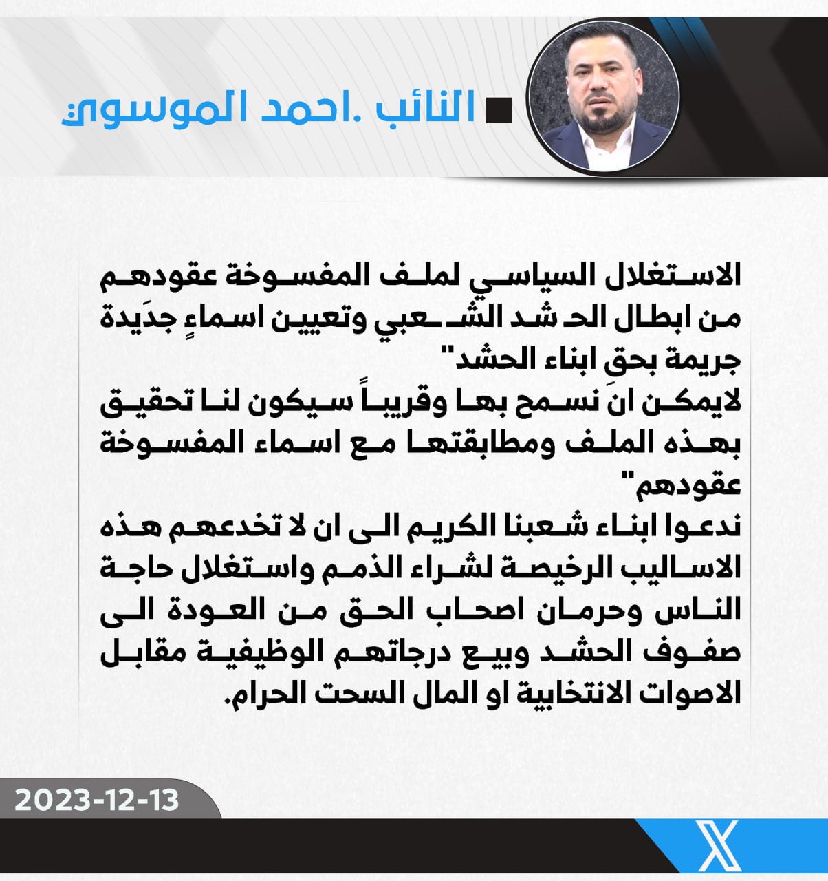 المزيدحذر النائب عن كتلة الصادقون، احمد الموسوي، الأربعاء، من محاولات أستغلال ملف المفسوخة عقودهم من الحشد الشعبي لتحقيق مكاسب أنتخابية ، كاشفا عن عزمه فتح تحقيق قريب لهذا الملف للحفاظ على حقوق...