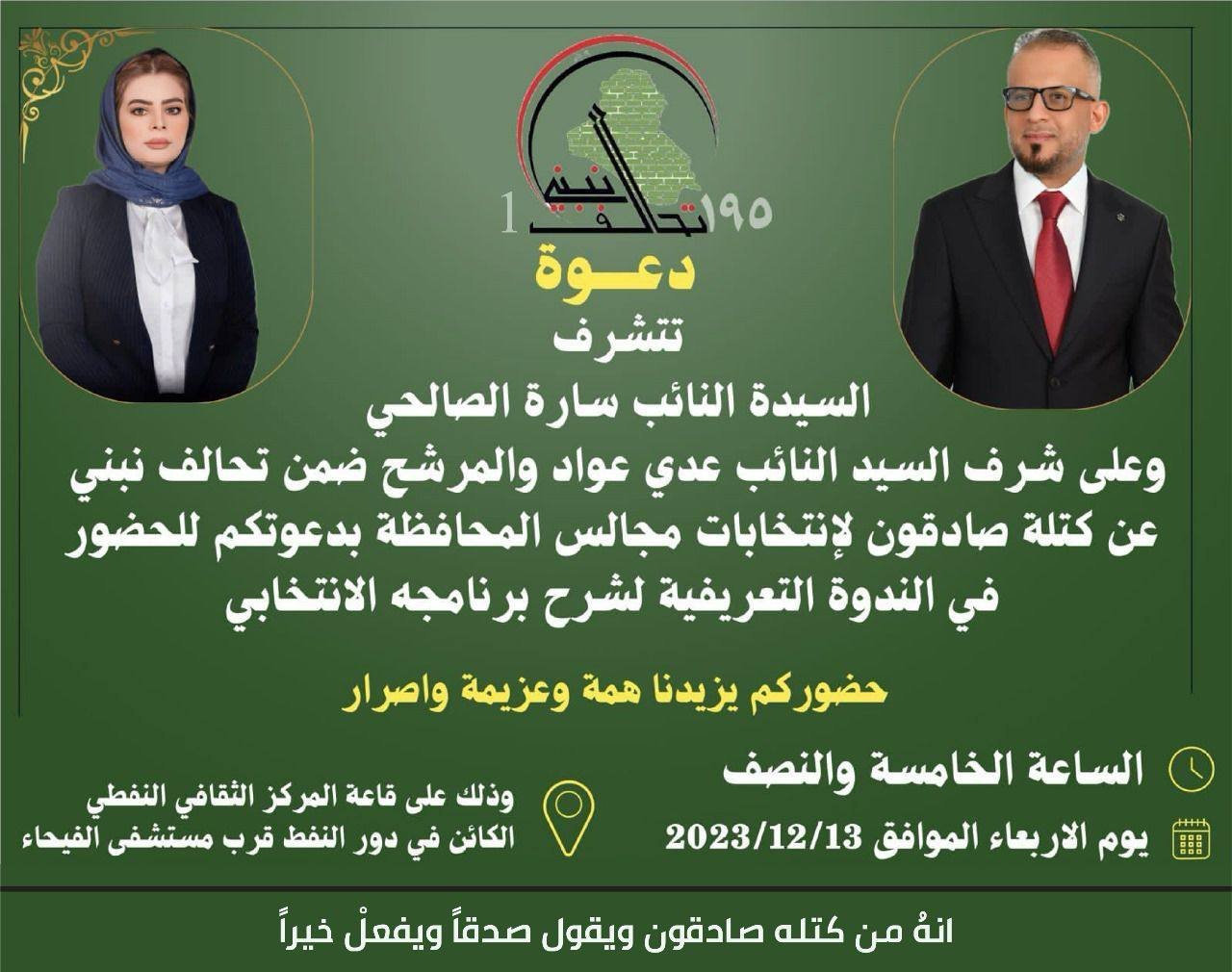 المزيدأقامت النائب عن كتلة الصادقون، سارة الصالحي ، ندوة تعريفية لشرح البرنامج الأنتخابي لمرشح تحالف "نبني" لأنتخابات مجلس محافظة البصرة ، عدي عواد . و ذكر بيان للمكتب الأعلامي للنائب سارة الصالحي،...