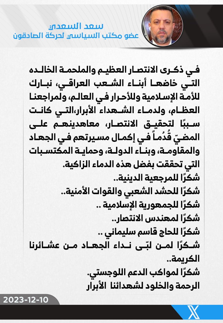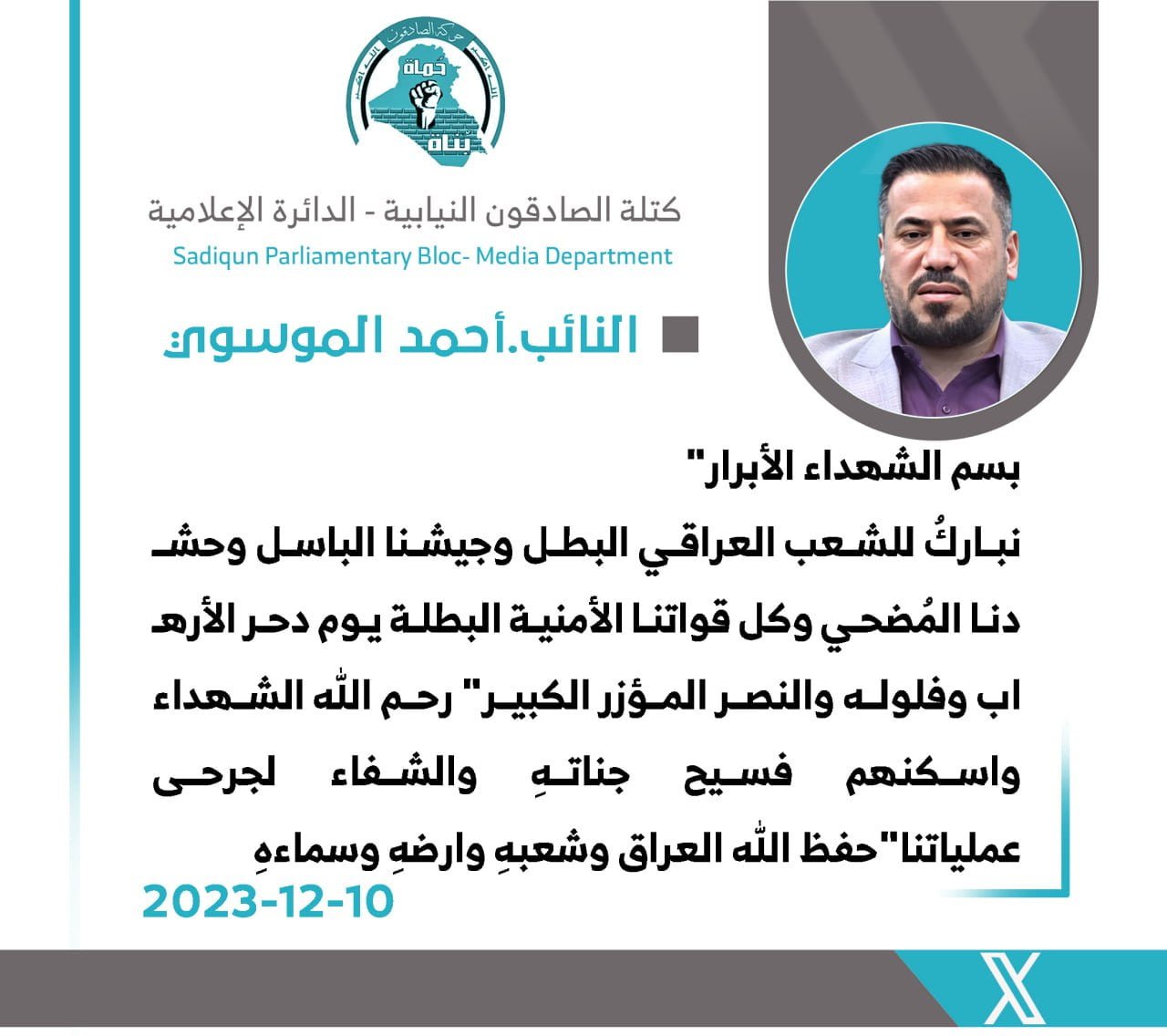 أكد النائب عن كتلة الصادقون ، رفيق الصالحي، اليوم الأحد، ان يوم النصر على الأرهاب سيبقى يؤماً خالداً في ضمير العراقيين عزيزاً على هذه الامة التي قاتلت بسلاحي الفتوة و الغيرة العراقية ، و فيما...