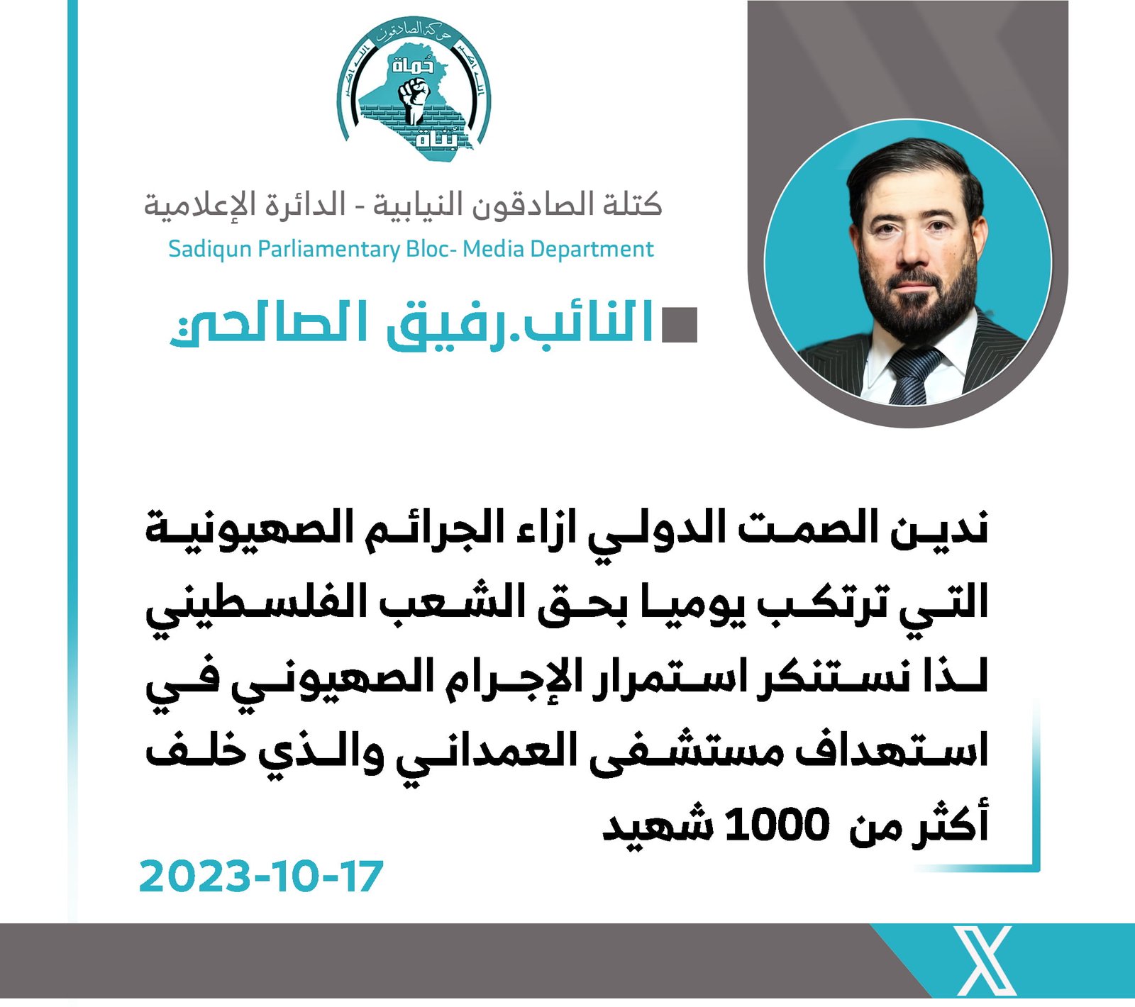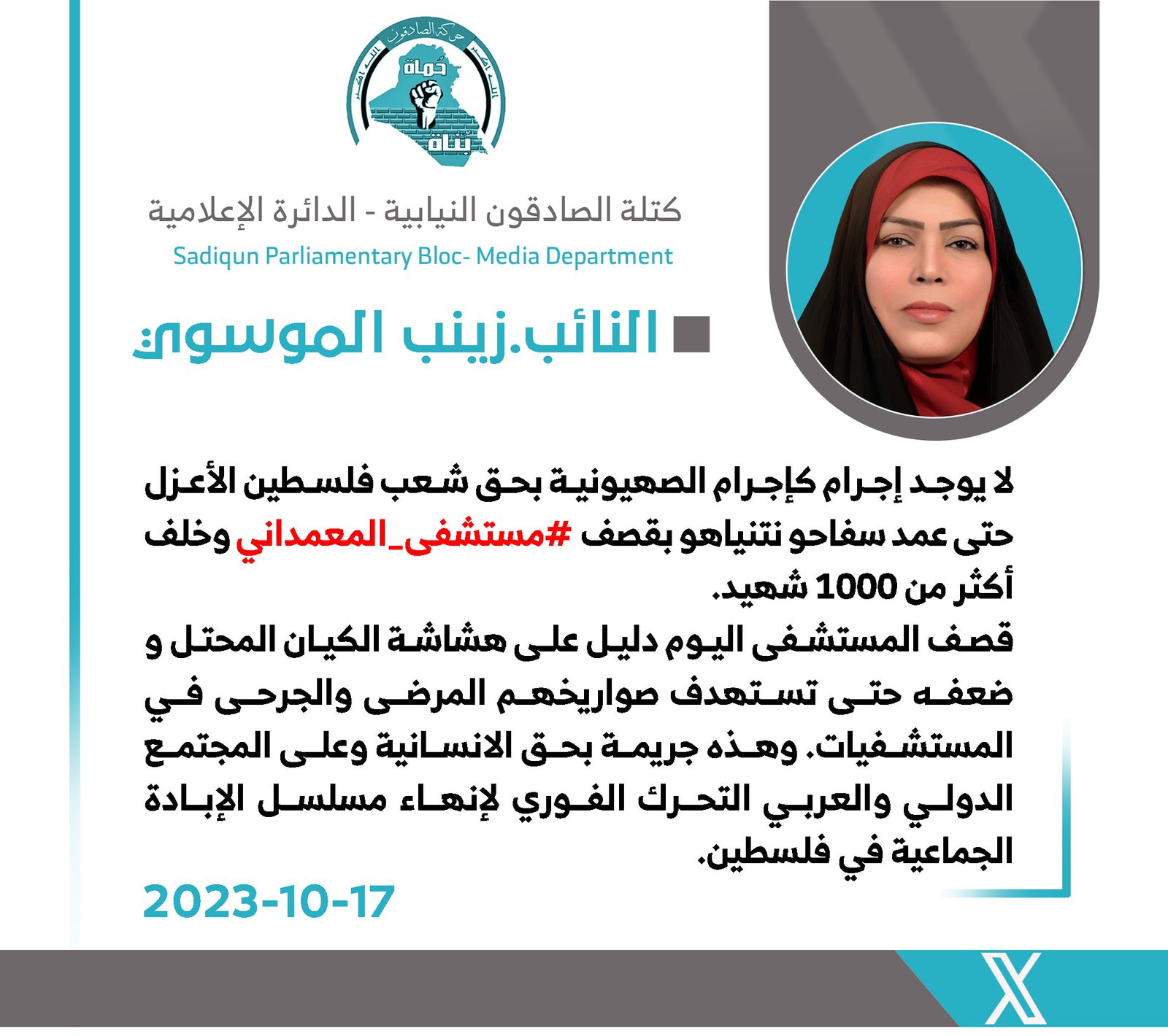 أستنكرت النائب عن كتلة الصادقون ، زينب الموسوي، الثلاثاء، جريمة استهداف مستشفى المعمداني في قطاع غزة من قبل العدو الصهيوني ، وفيما اعتبرت الامر جريمة بحق الانسانية ، اكدت انها تعكس هشاشة...