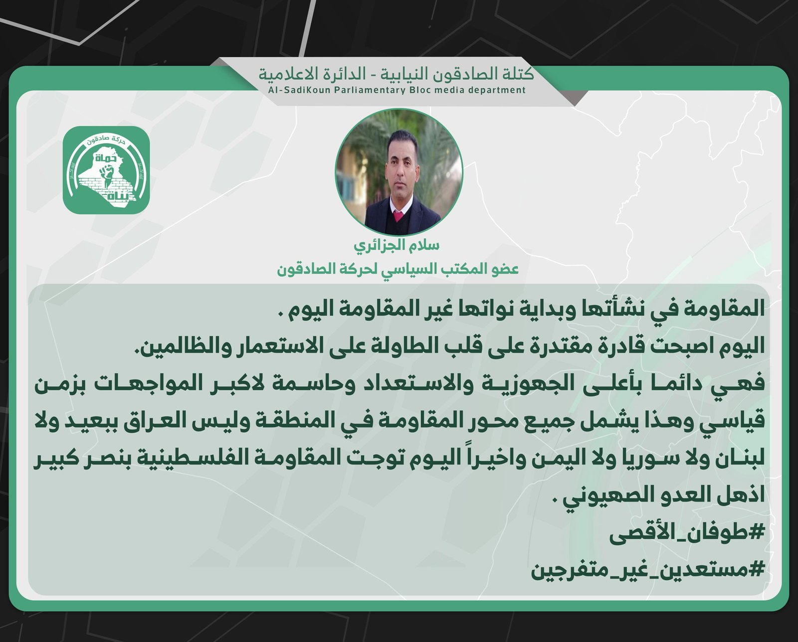 الدليمي: الانتصار بعملية “طوفان الاقصى” سيستمر و سيثبت للتاريخ والاجيال نهاية إسرائيل وانطواء صفحتها 77 ... المزيد