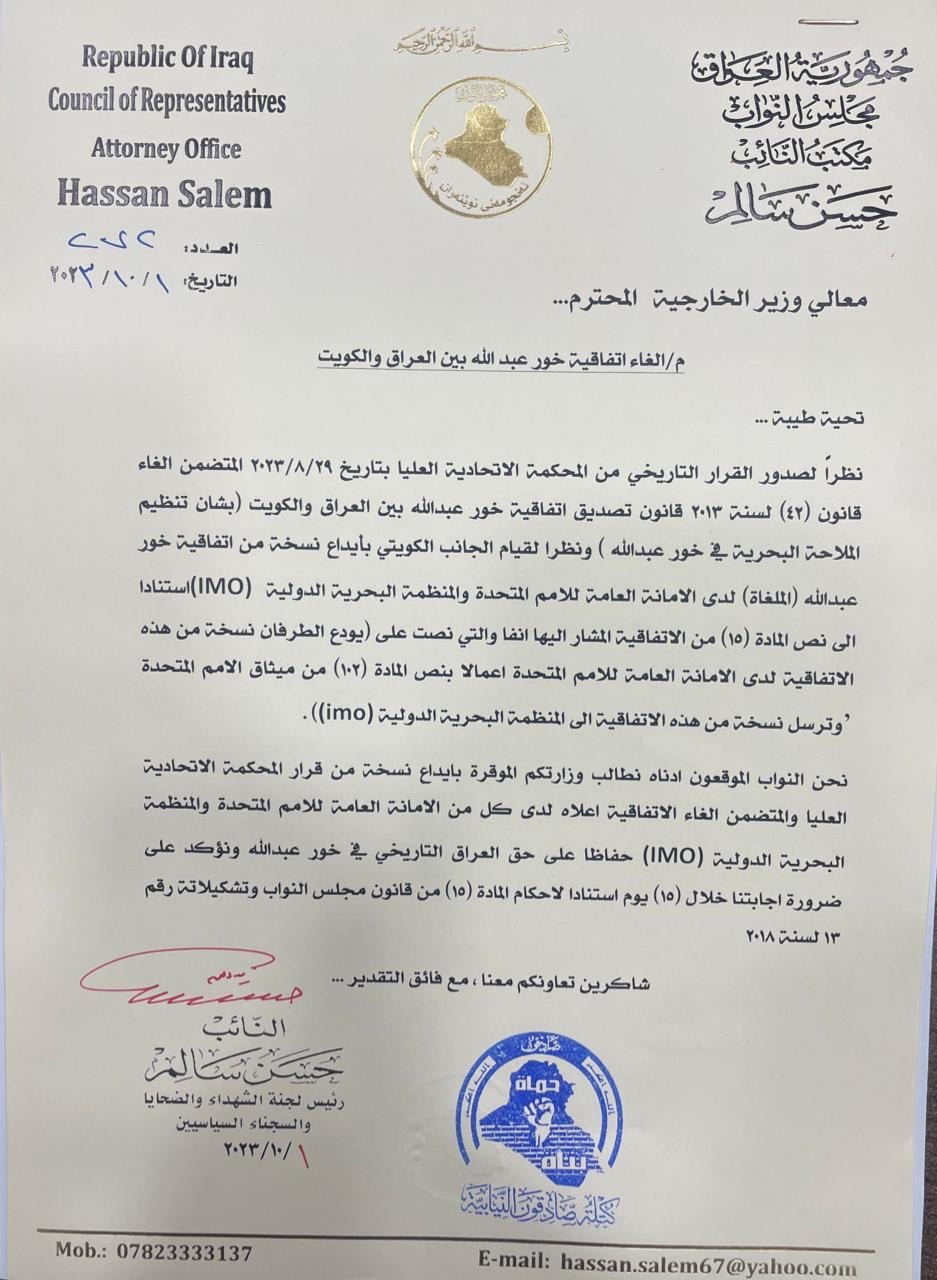 المزيددعا المتحدث باسم كتلة الصادقون محمد البلداوي ، الجمعة، الحكومة الى إيداع نسخة من بطلان اتفاقية خور عبد الله لدى الأمم المتحدة ، مبينا الظروف و الاسباب التي ادت الى توقيعها مع الجانب الكويتي...