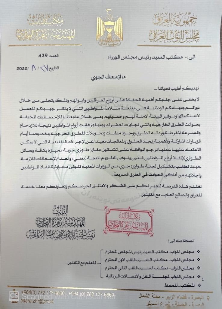 بالوثيقة .. البجاري تطالب بتشكيل فرق أسعاف جوي لأنقاذ المصابين جراء حوادث الطرق الخارجية