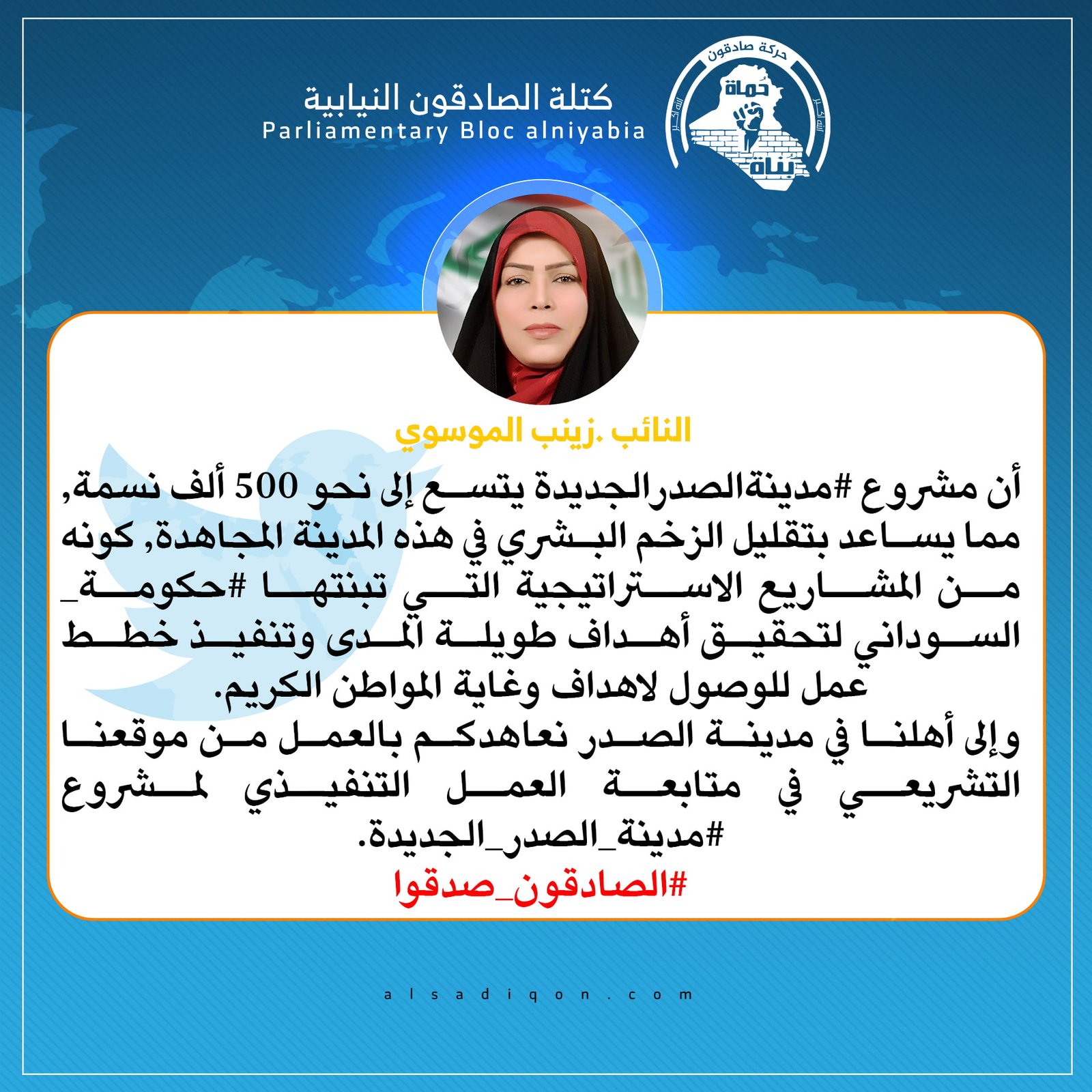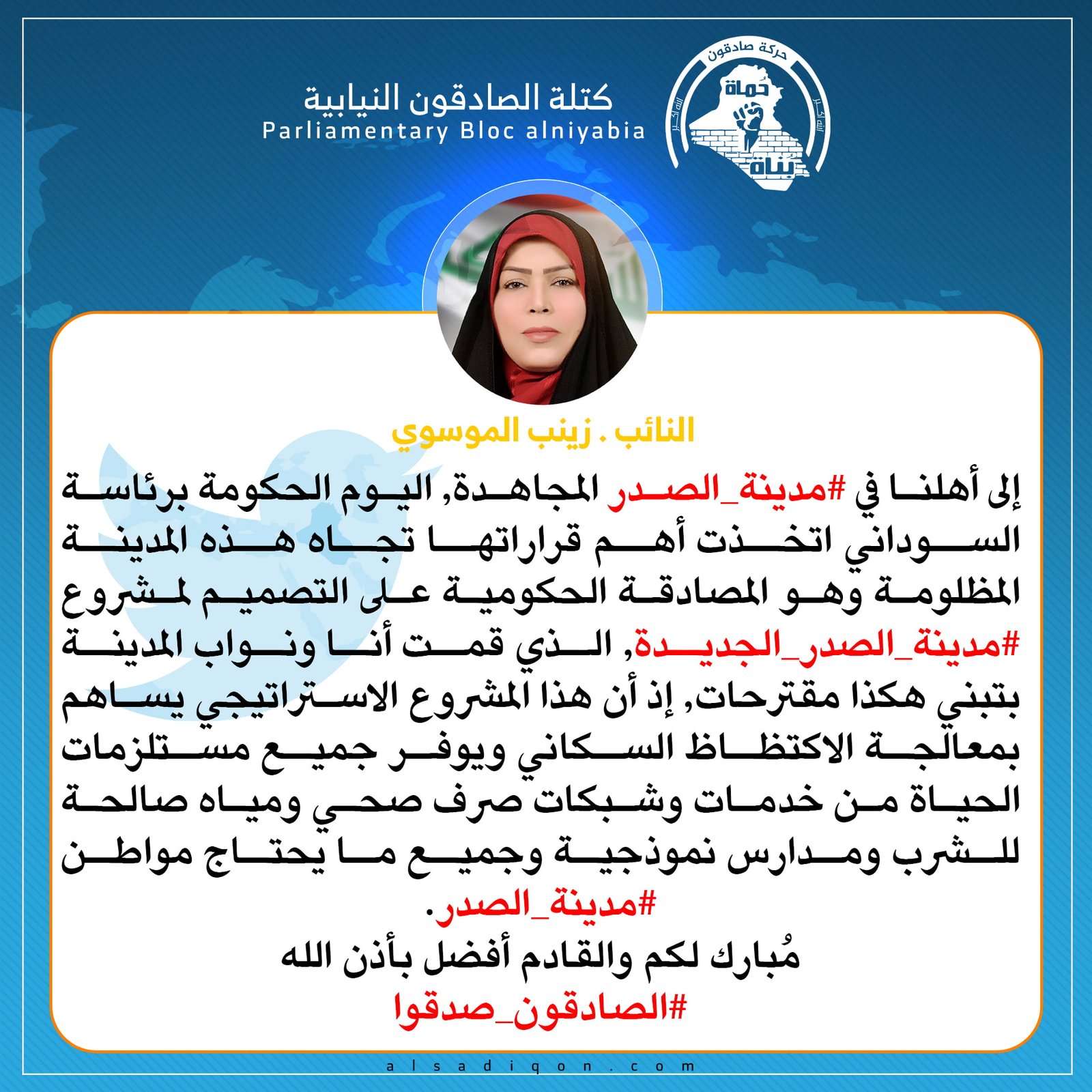 عبر دورها الرقابي .. الموسوي تتعهد بمتابعة العمل التنفيذي لمشروع مدينة الصدر الجديدة
