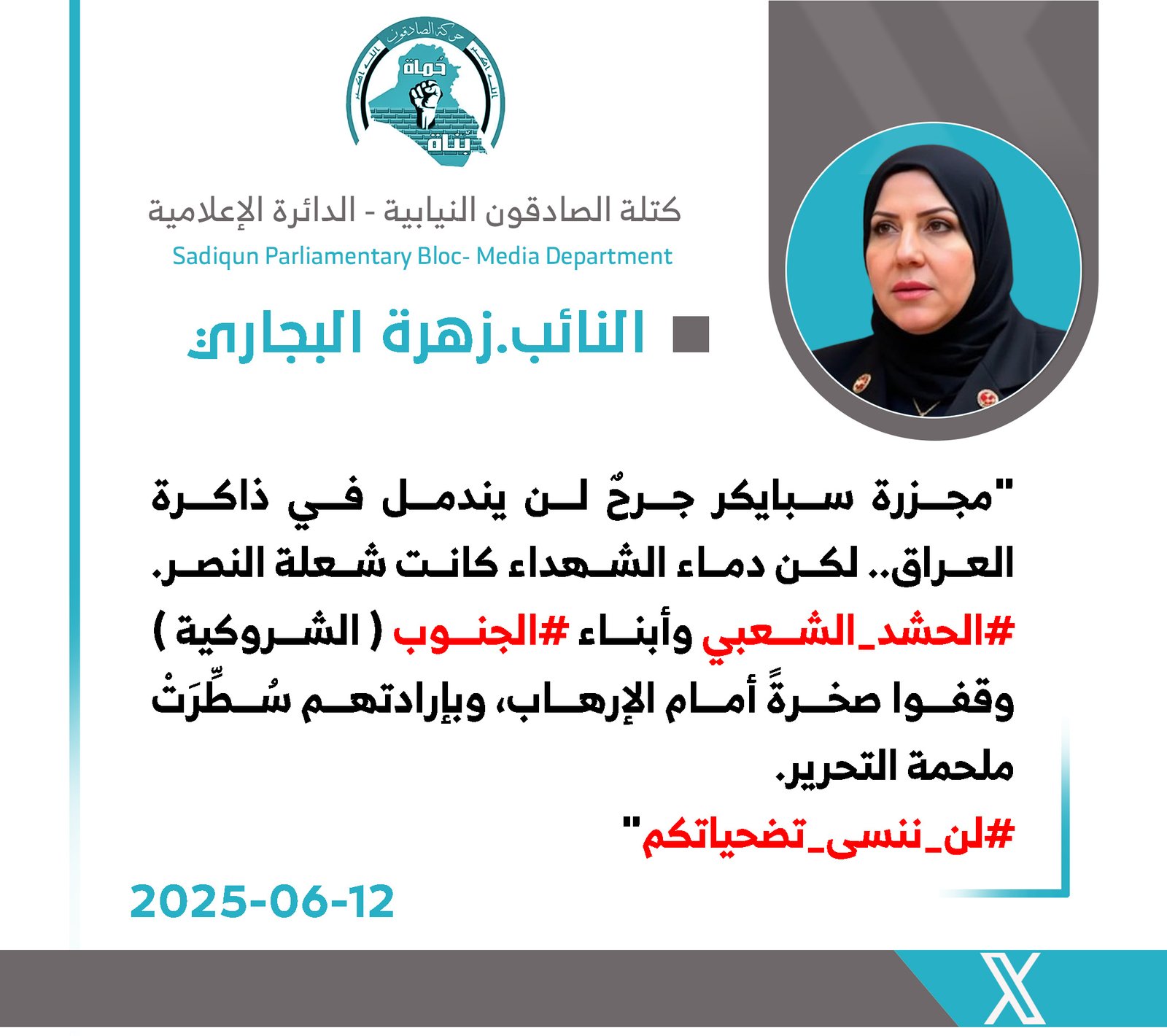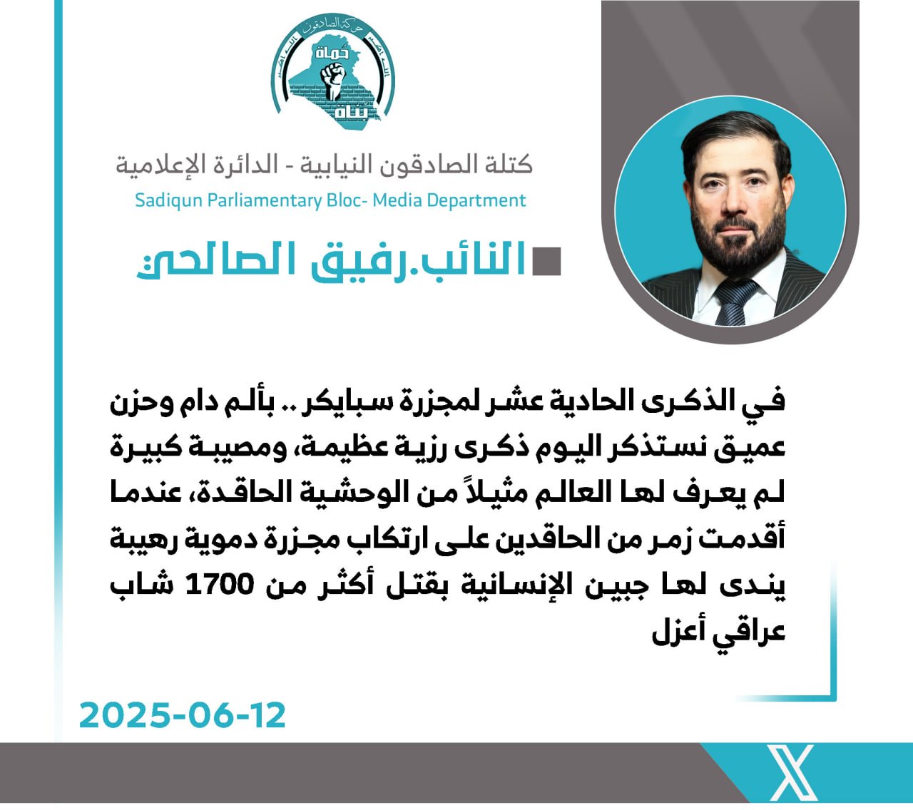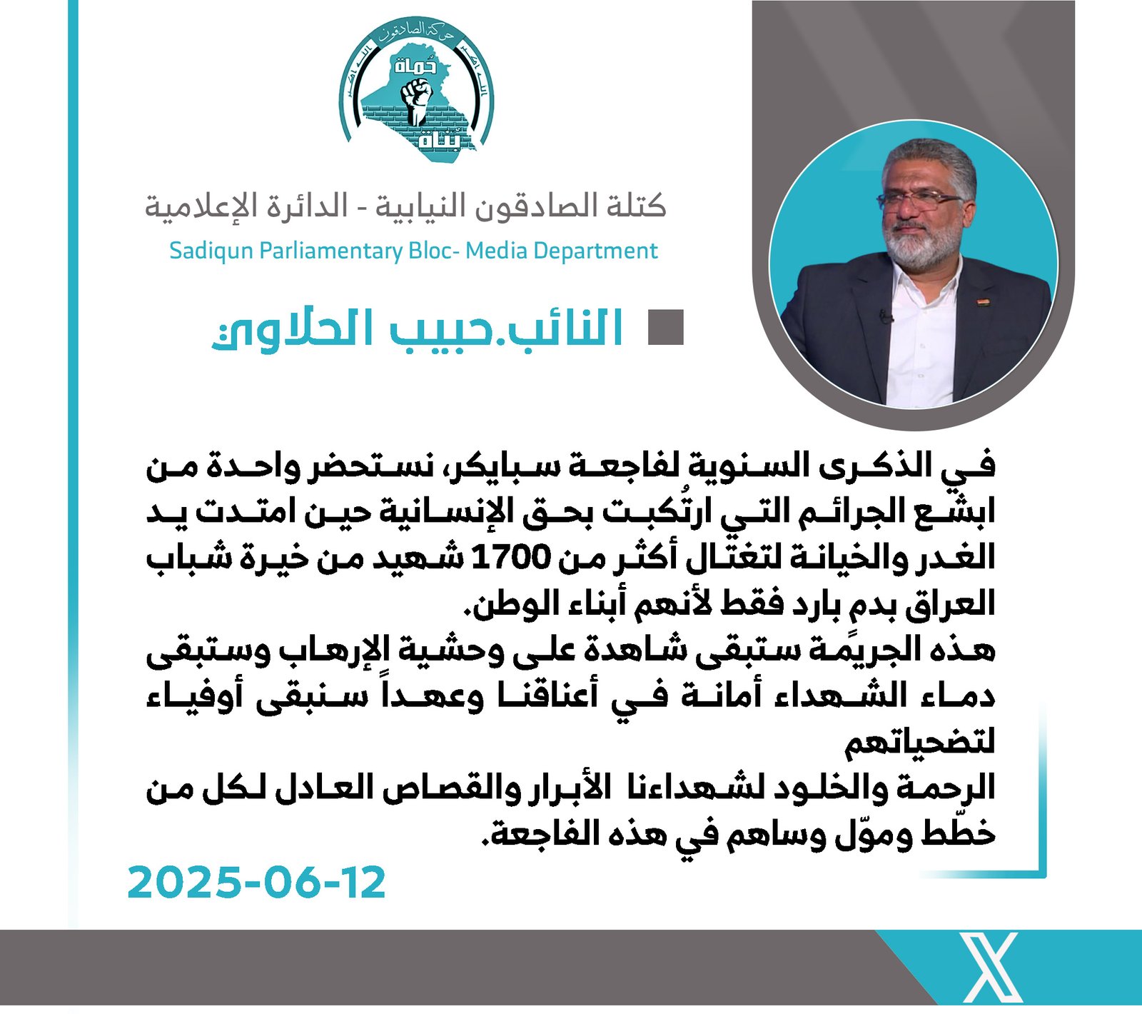 استذكر رئيس كتلة الصادقون النيابية، النائب حبيب الحلاوي، اليوم الخميس، الذكرى السنوية لفاجعة سبايكر، مؤكدًا أنها تمثل واحدة من أبشع الجرائم التي ارتُكبت بحق الإنسانية، حين امتدت يد الغدر...