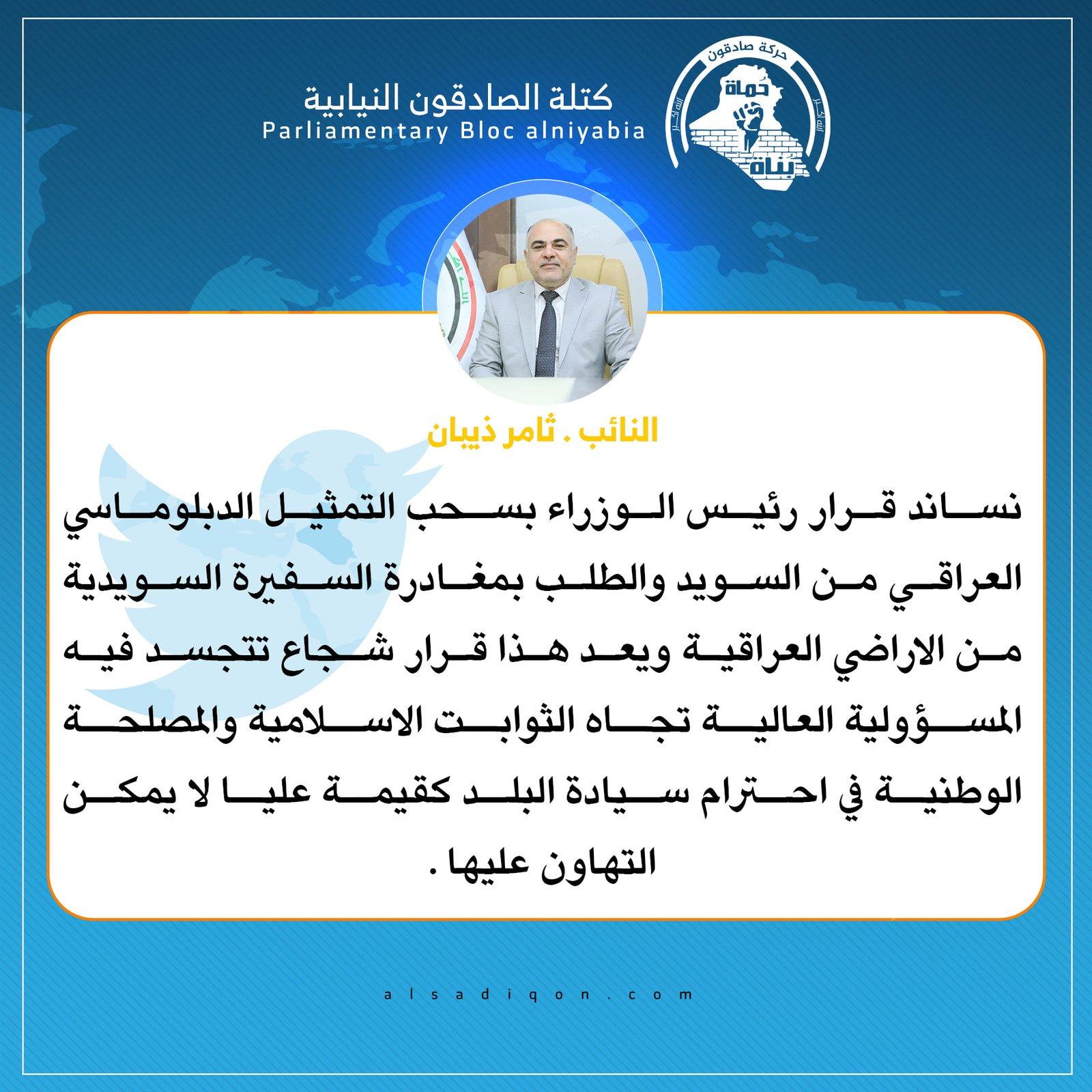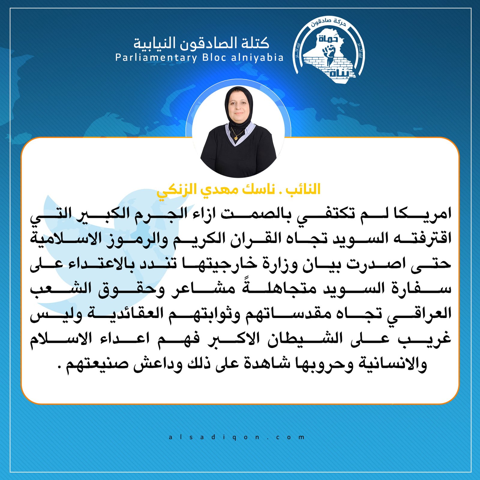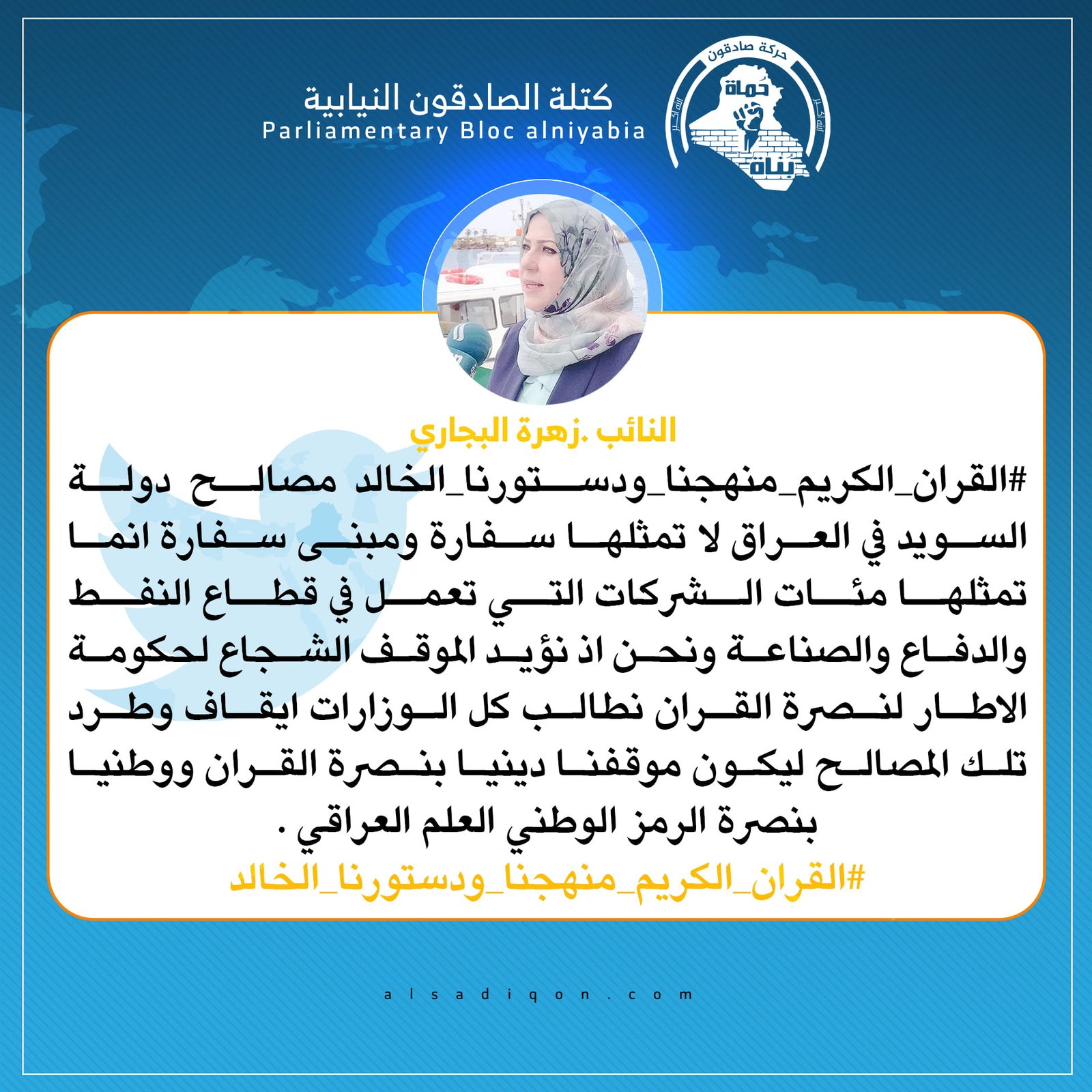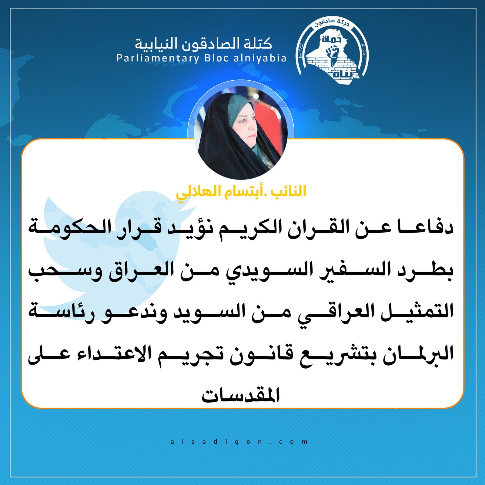 الموسوي تطالب بتحويل سفارات العراق في السويد و الدنمارك الى مساجد رداً على حرق المصحف الشريف
