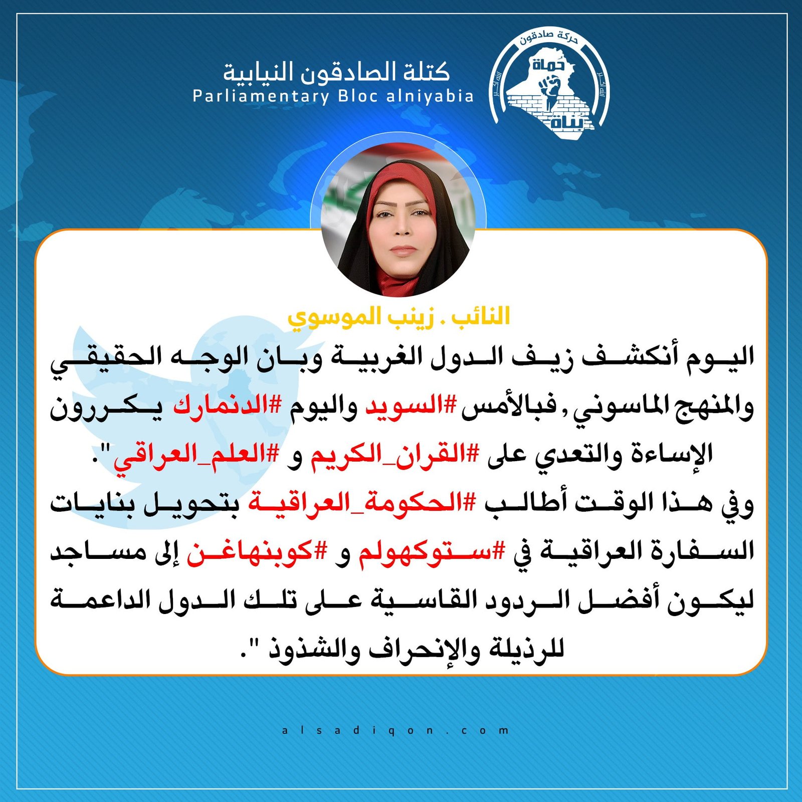 أكدت النائب عن كتلة الصادقون ، زينب الموسوي ، السبت، ان الممارسات الاستفزازية التي تنتهجها دول الغرب لاسيما السويد و الدنمارك ، كشفت وجههاالماسوني المعادي للأسلام ، فيما طالبت بتحويل سفارات...