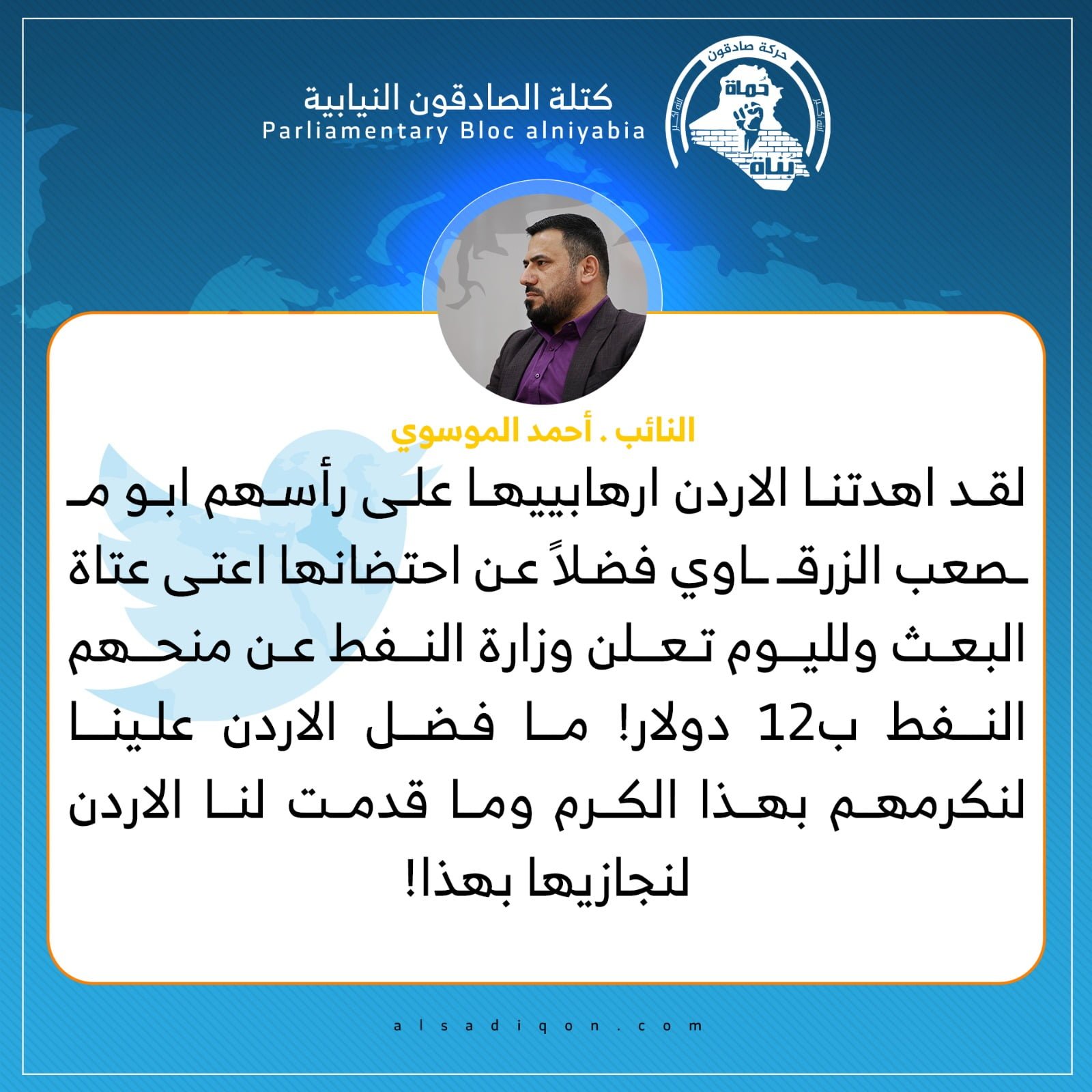 الموسوي ينتقد قرار منح الأردن النفط مقابل اسعار مخفضة رغم مواقفها السلبية اتجاه العراق