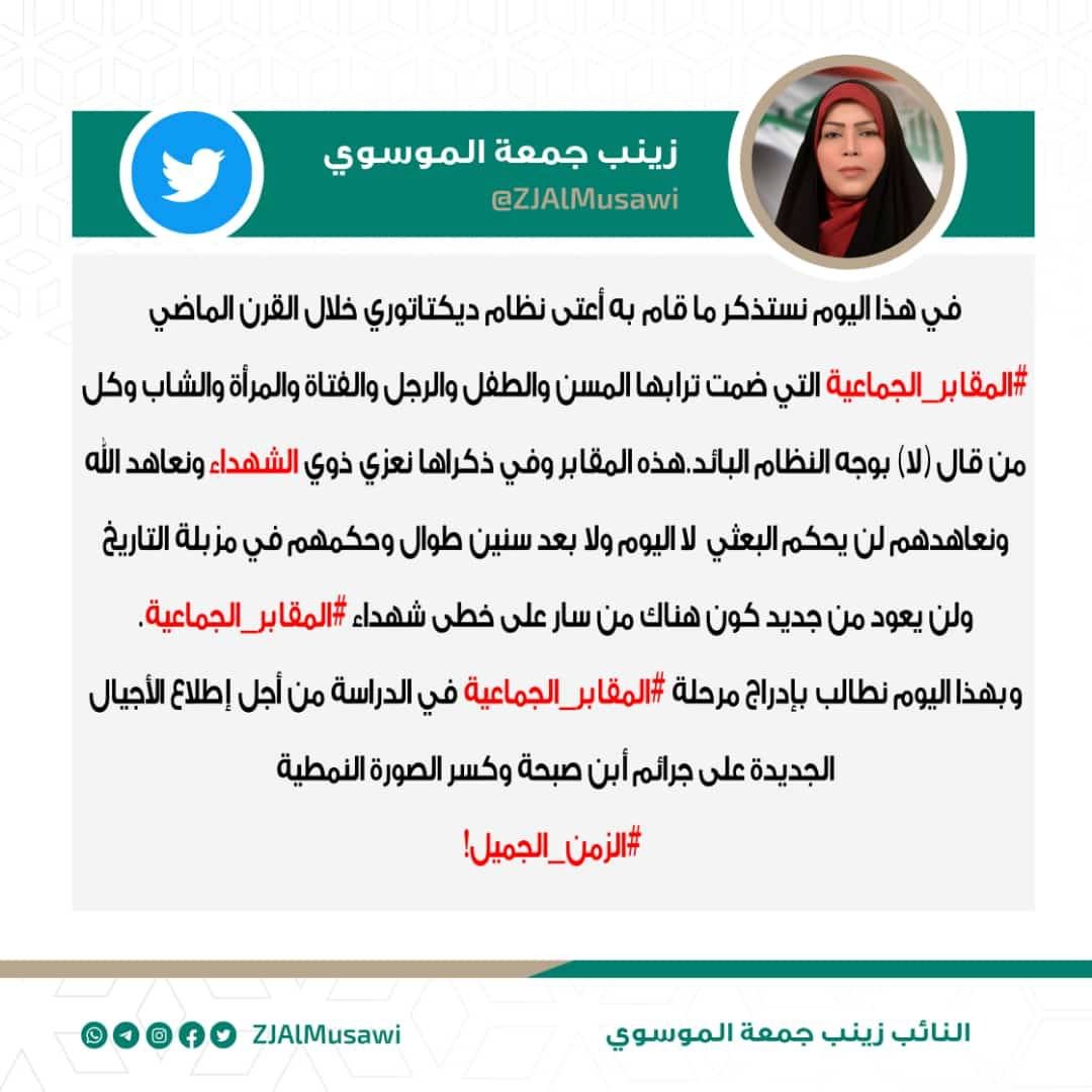 الموسوي تطالب بإدراج المقابر الجماعية في المناهج الدراسية لإطلاع الأجيال القادمة على جرائم البعث