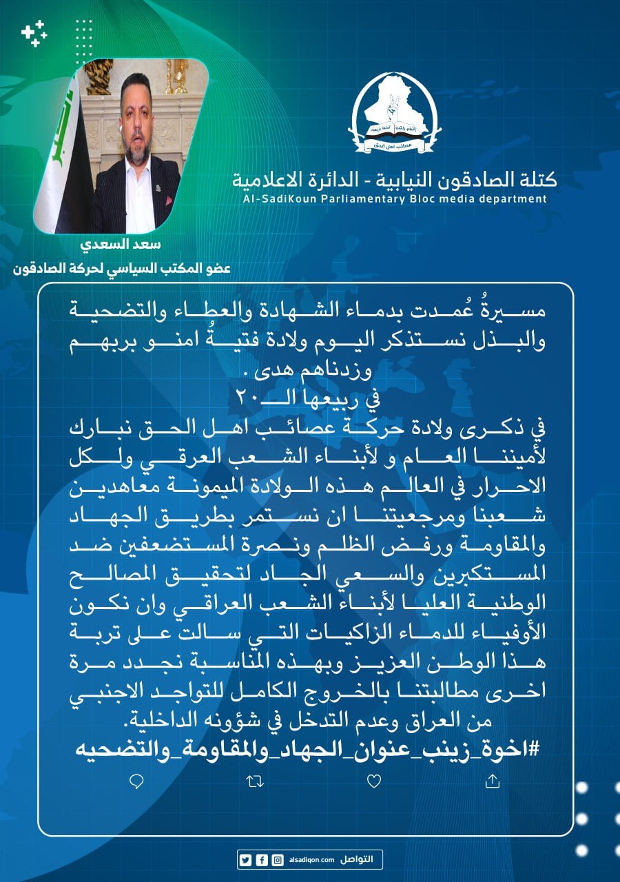 اكد عضو المكتب السياسي لحركة عصائب أهل الحق ، احمد عبد الحسين ،السبت، ان الحركة استطاعت ان تحقق التمازج بين المقاومة والدولة لاستثارة عناصر القوة في المجتمع ، وذلك بالتزامن حلول الذكرى...