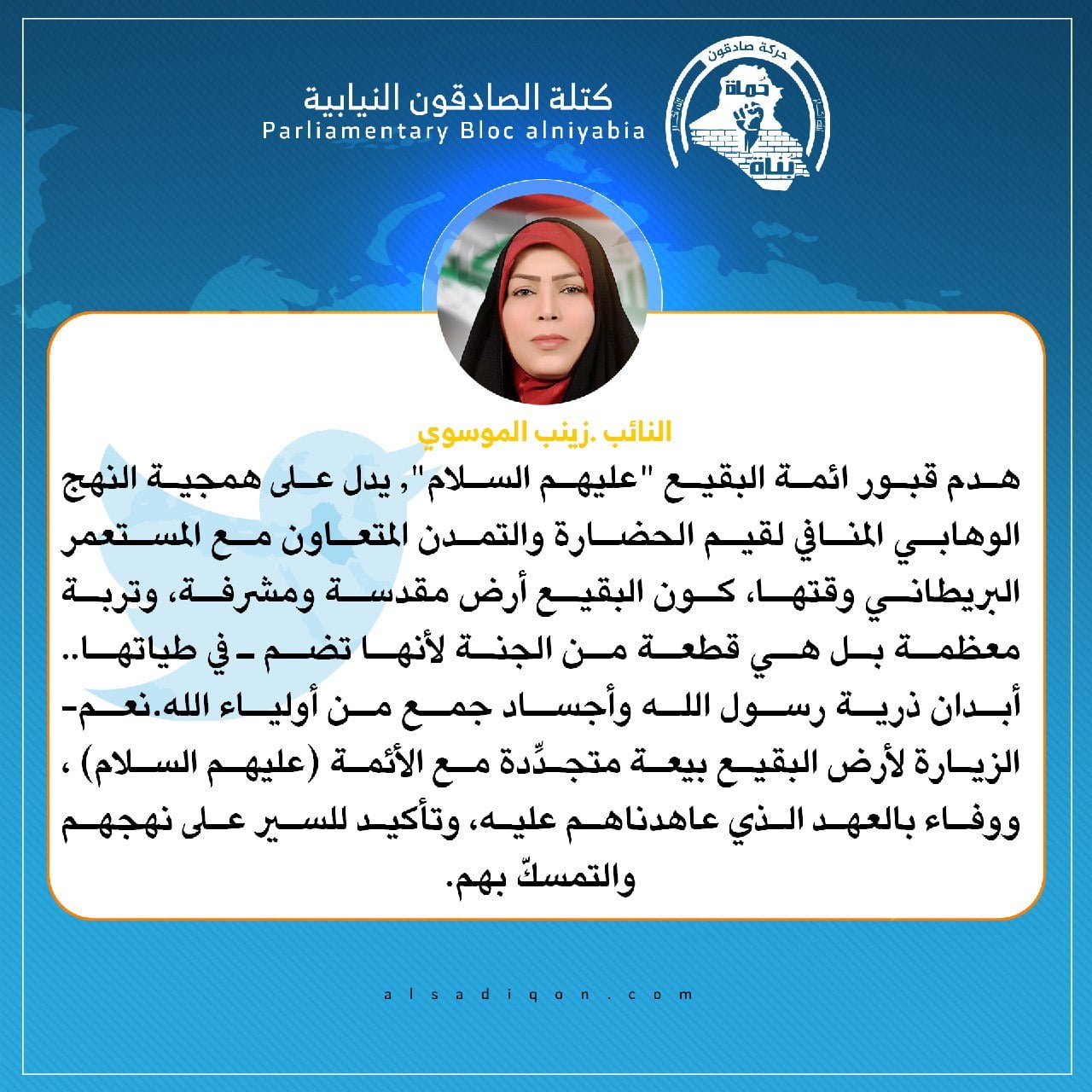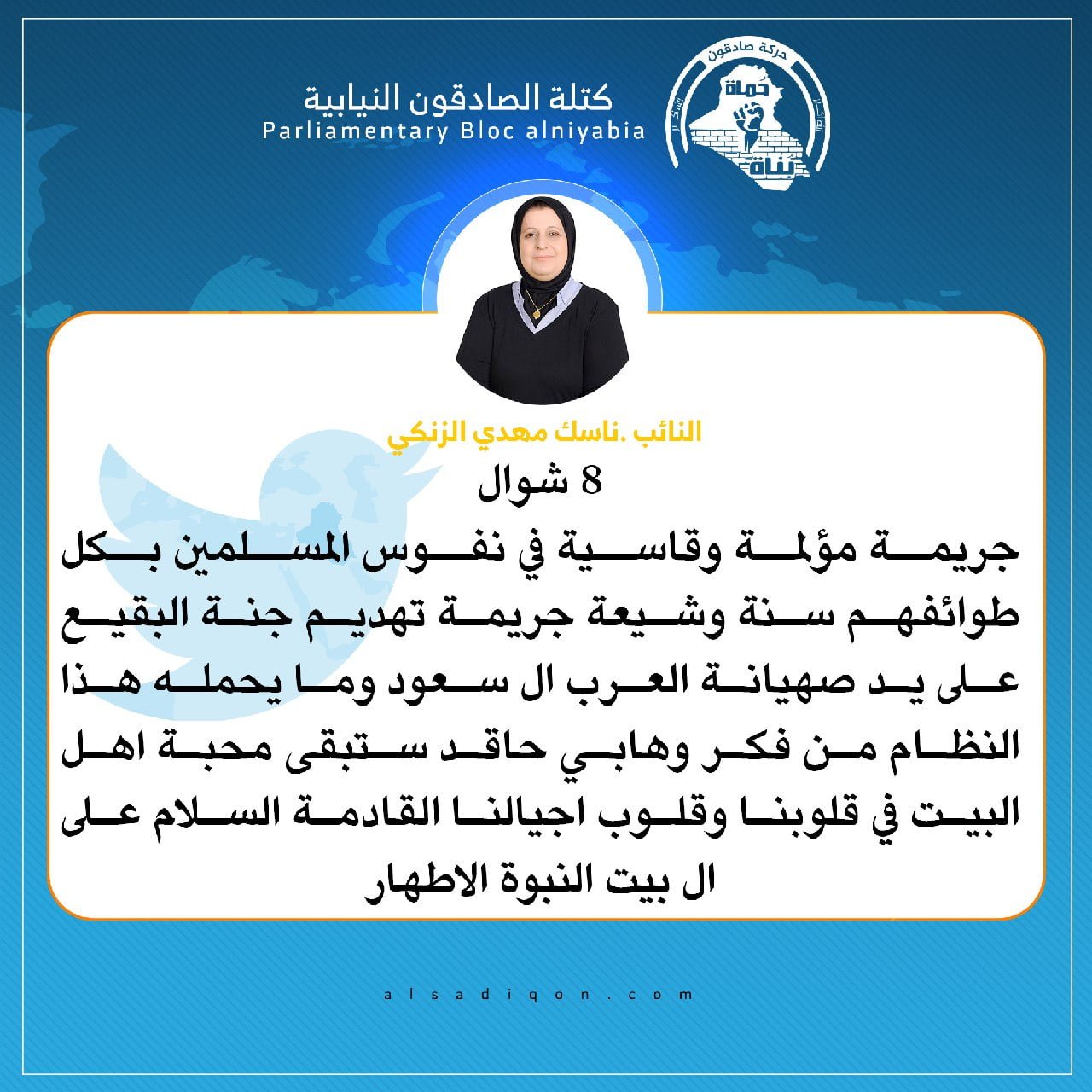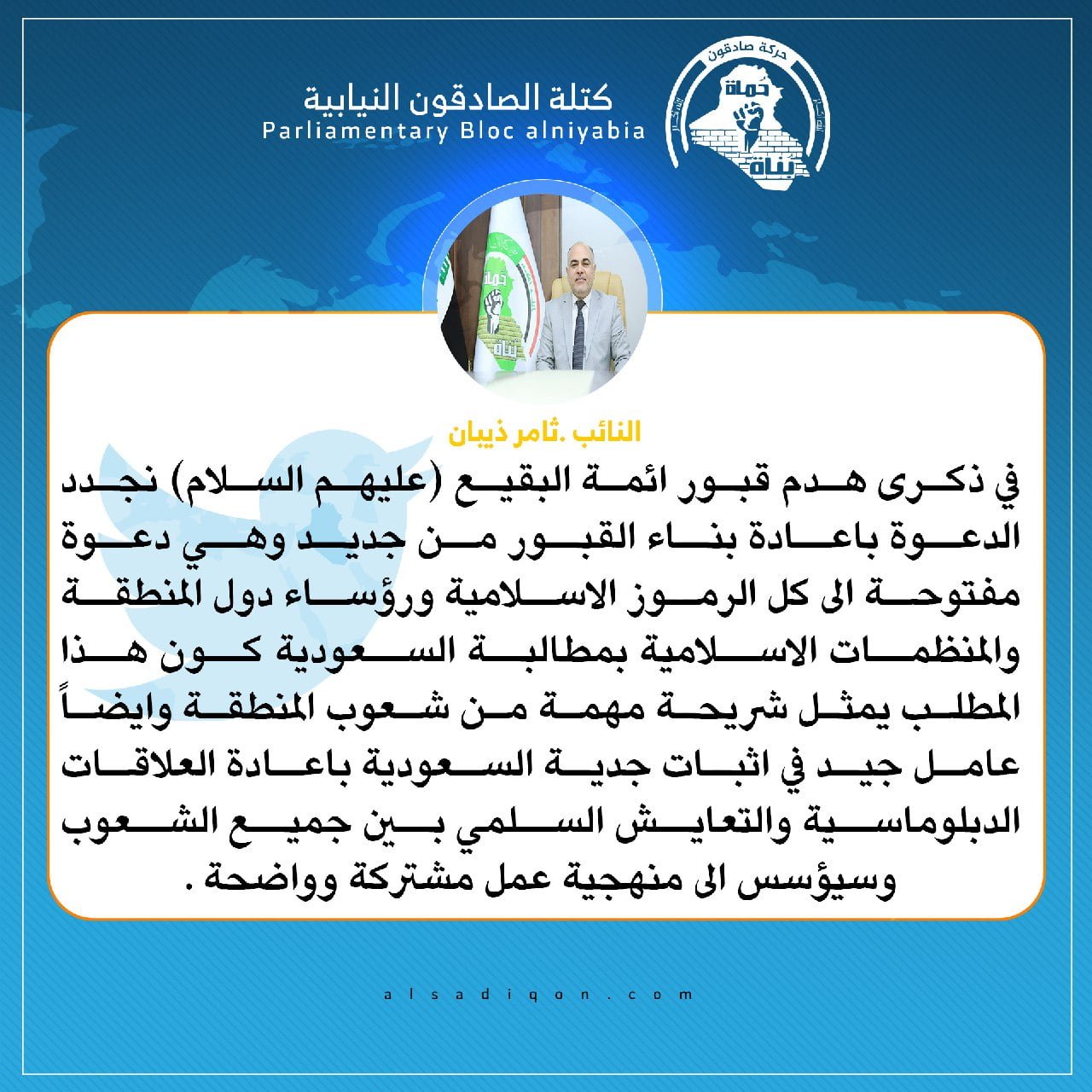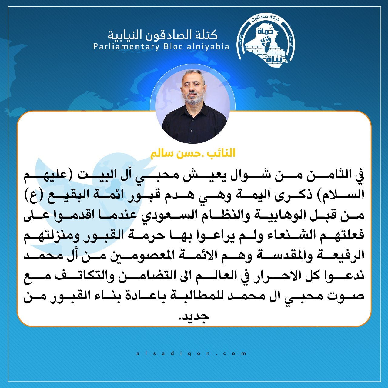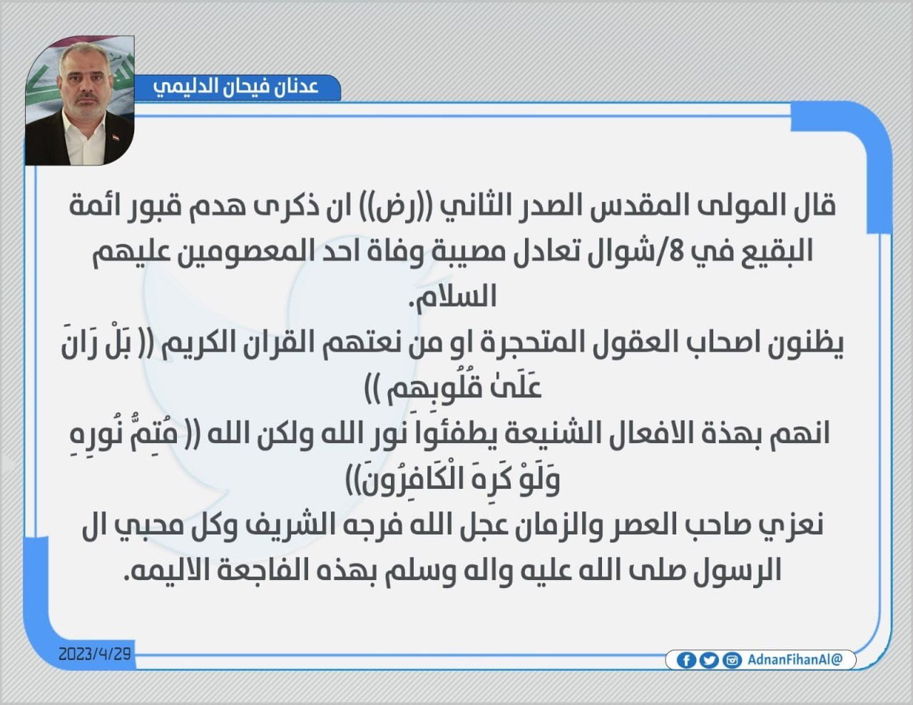 فيحان يقدم التعازي لمقام صاحب الزمان (عج) و محبي أهل البيت (ع) بذكرى هدم قبور ائمة البقيع