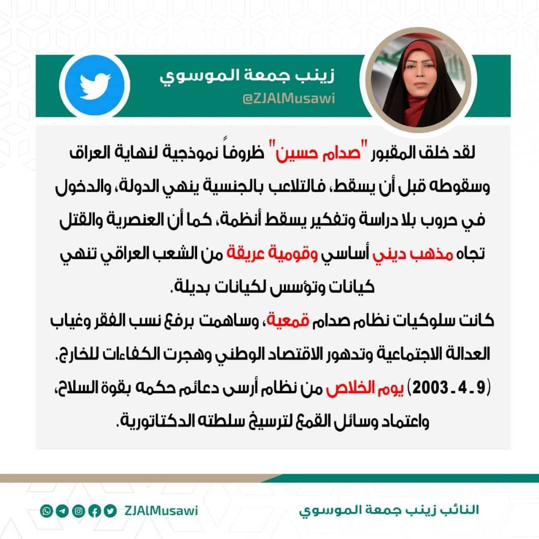 الموسوي: السياسات القمعية التي انتهجها النظام المقبور خلقت الظروف النموذجية لسقوطه