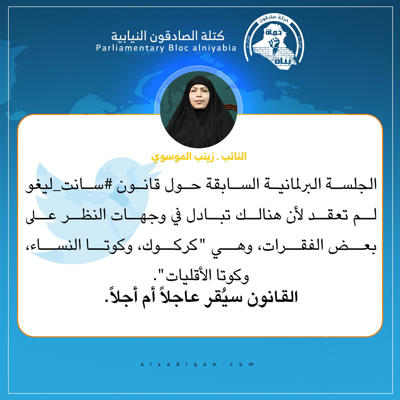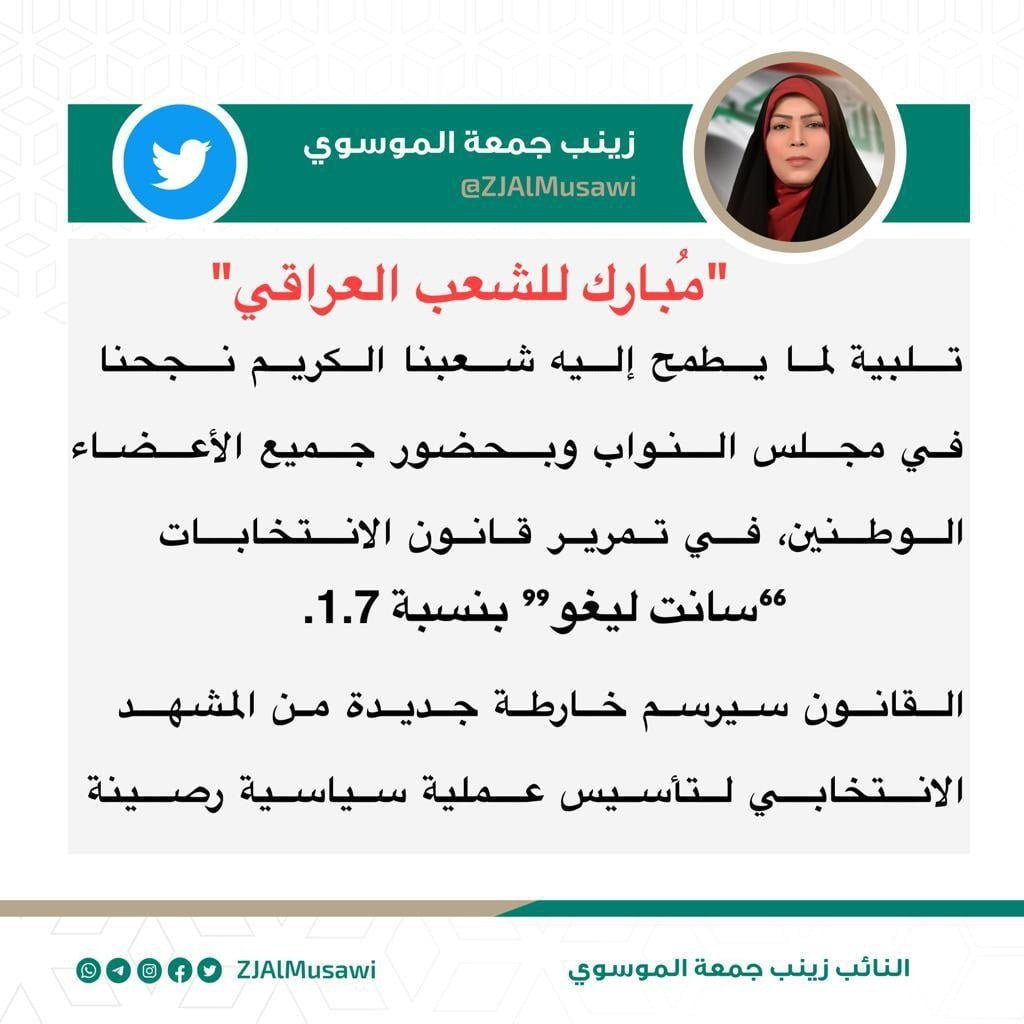 الموسوي تبارك نجاح البرلمان بتمرير تعديل قانون الأنتخابات لتأسيس عملية سياسية رصينة
