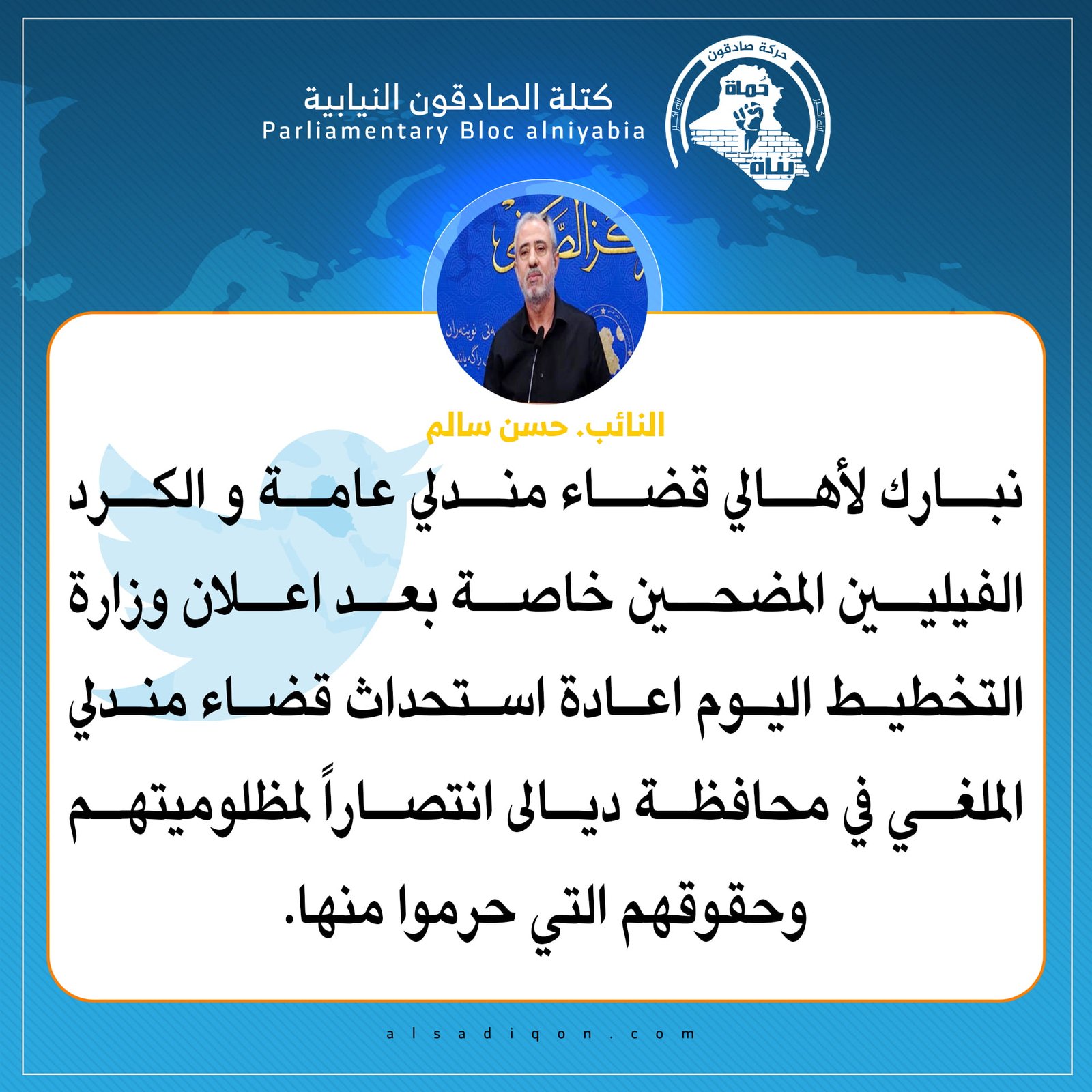 النائب حسن سالم يرحب بقرار اعادة استحداث قضاء مندلي في محافظة ديالى