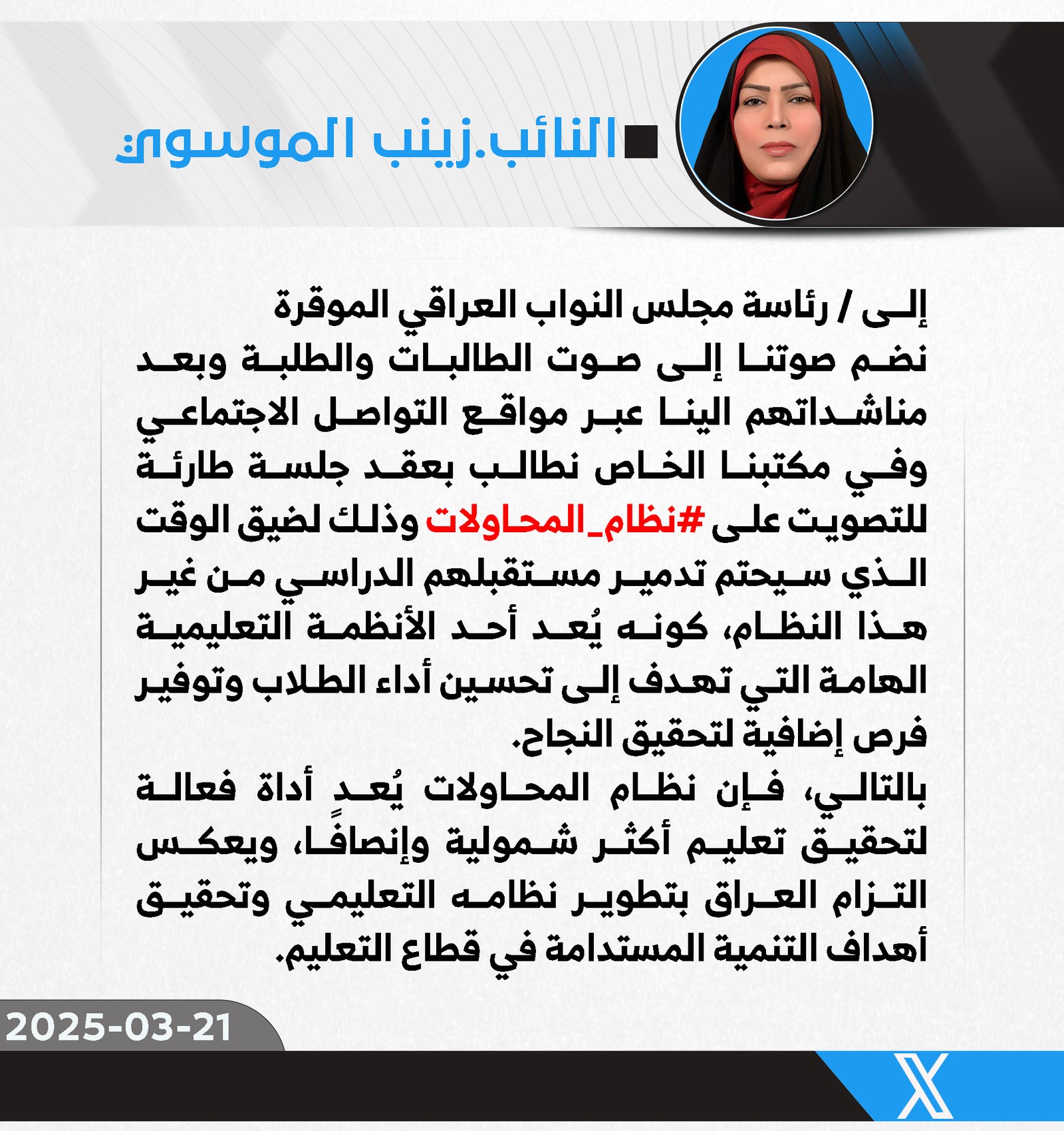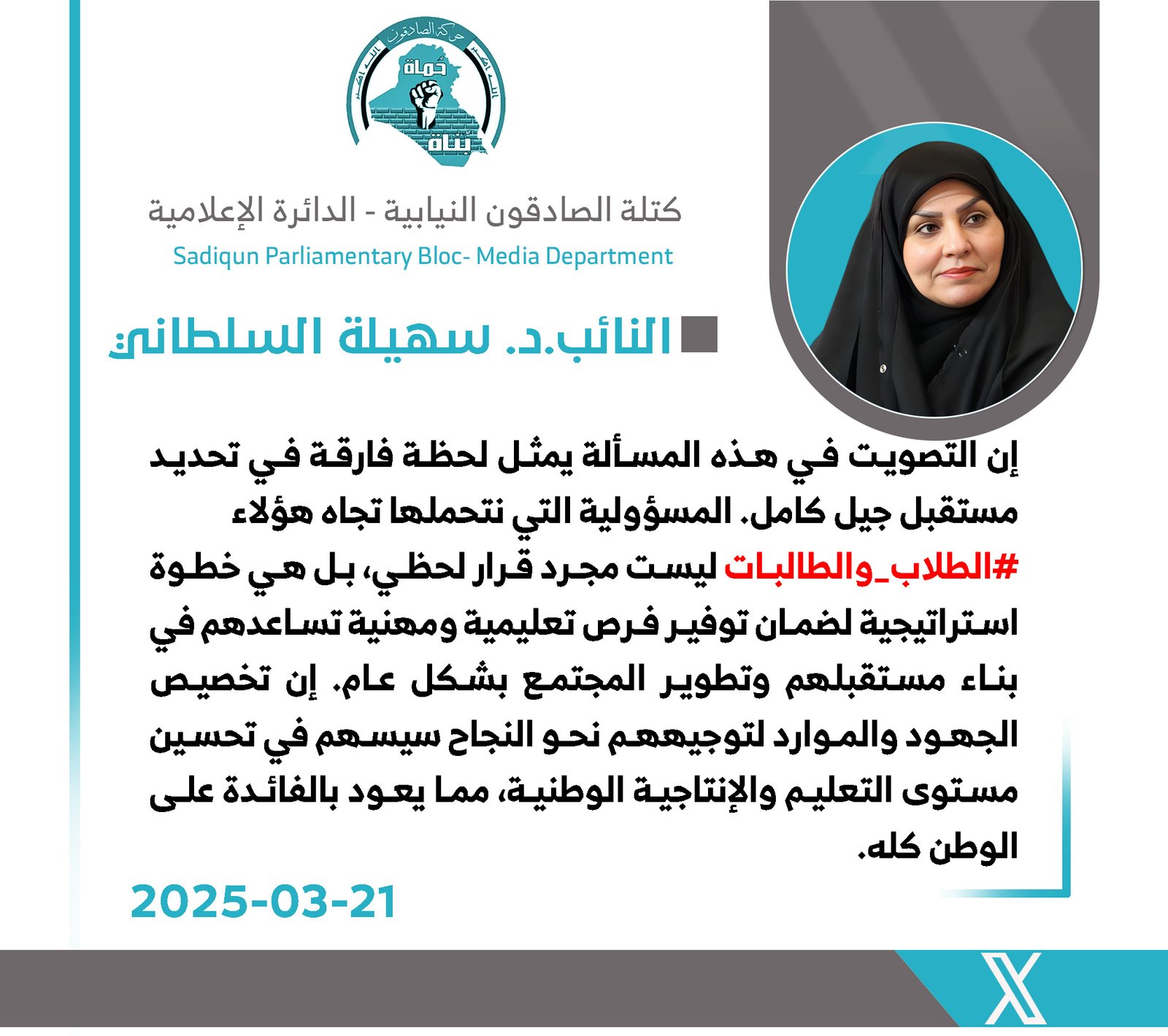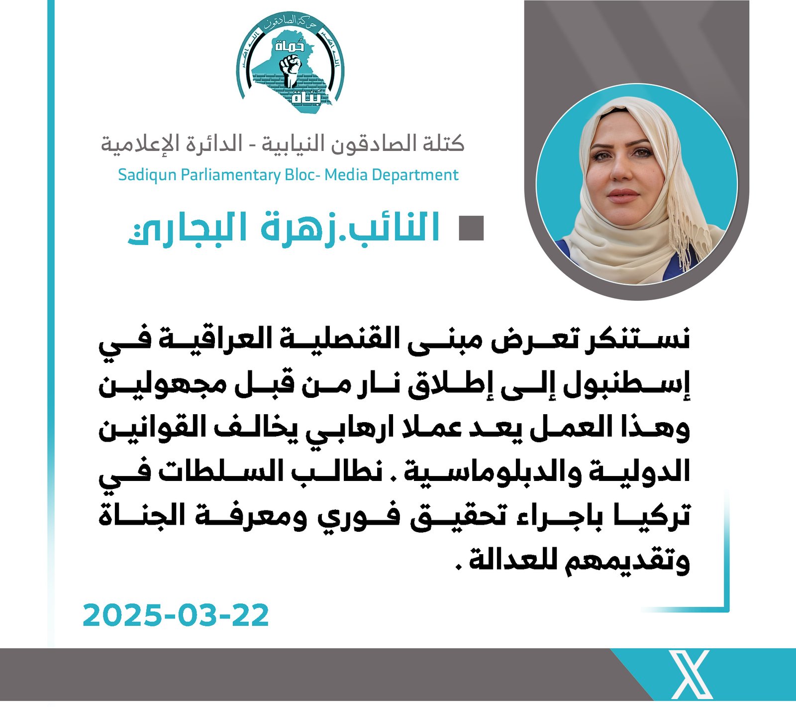 دعت رئيس لجنة النقل والاتصالات النيابية عن كتلة صادقون، زهرة البجاري، اليوم الأحد، وزارة الخارجية العراقية إلى التدخل العاجل في قضية الناشطة زينب الأسدي، التي اعتقلتها السلطات السعودية بعد...