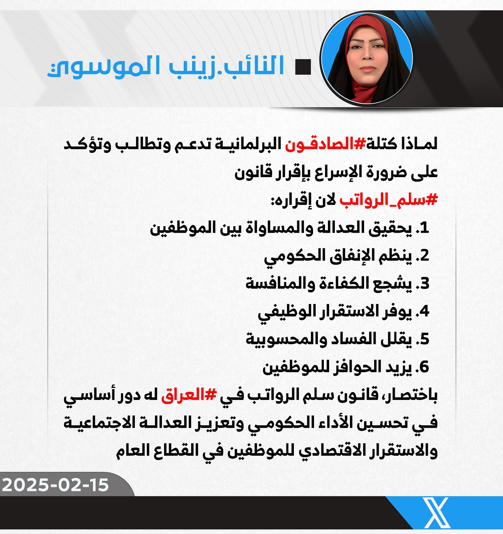 أكدت النائب عن كتلة الصادقون البرلمانية، زينب الموسوي، على ضرورة الإسراع في إقرار قانون سلم الرواتب، لما له من أهمية كبيرة في تحقيق العدالة الاجتماعية وتعزيز الاستقرار الاقتصادي في...